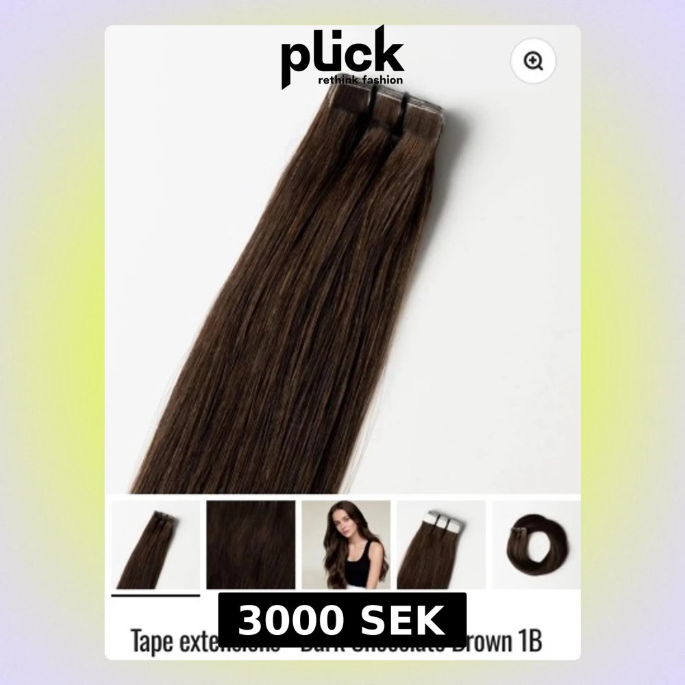 Tape extensions i färgen Dark Chocolate Brown 1B från Myextensions. Snygg, djupbrun nyans med naturlig glans och mjukt. Det är 4 paket och i ett paket är det 50g så totalt är det 200g och 50 centimeter långt. Har haft dom två gånger i mitt hår alltså två omsättningar med tape. Håret är i bra skick. Nypriset är 4 200kr