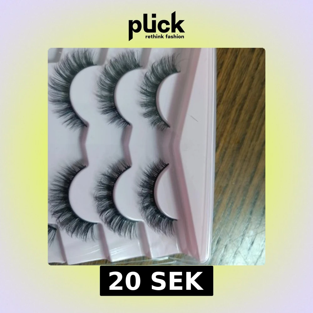 Säljer svarta lösögonfransar med mycket volym och fluffig finish. Fransarna har en böjd form och ger en dramatisk look, perfekta för att framhäva ögonen. Kommer i en rosa plastförpackning.
