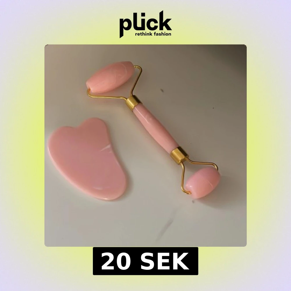 Säljer ett set med en ansiktsroller och en gua sha-sten i ljusrosa sten med guldfärgade detaljer. Perfekt för att boosta hudvårdsrutinen och ge ansiktet en fräsch känsla. Båda verktygen är släta och känns lyxiga i handen.