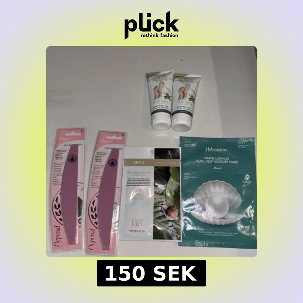 Säljer två rosa extra fina nagelfilar från Depend, perfekt för att få snygga nagelkanter. Två tuber Depend Aloe Vera foot peeling, 75 ml, för mjuka fötter. Ansiktsmasker: JMsolution Marine Luminous Pearl Deep Moisture Mask och Lamelin Snail Calming Moisture Mask Pack för återfuktning och glow.