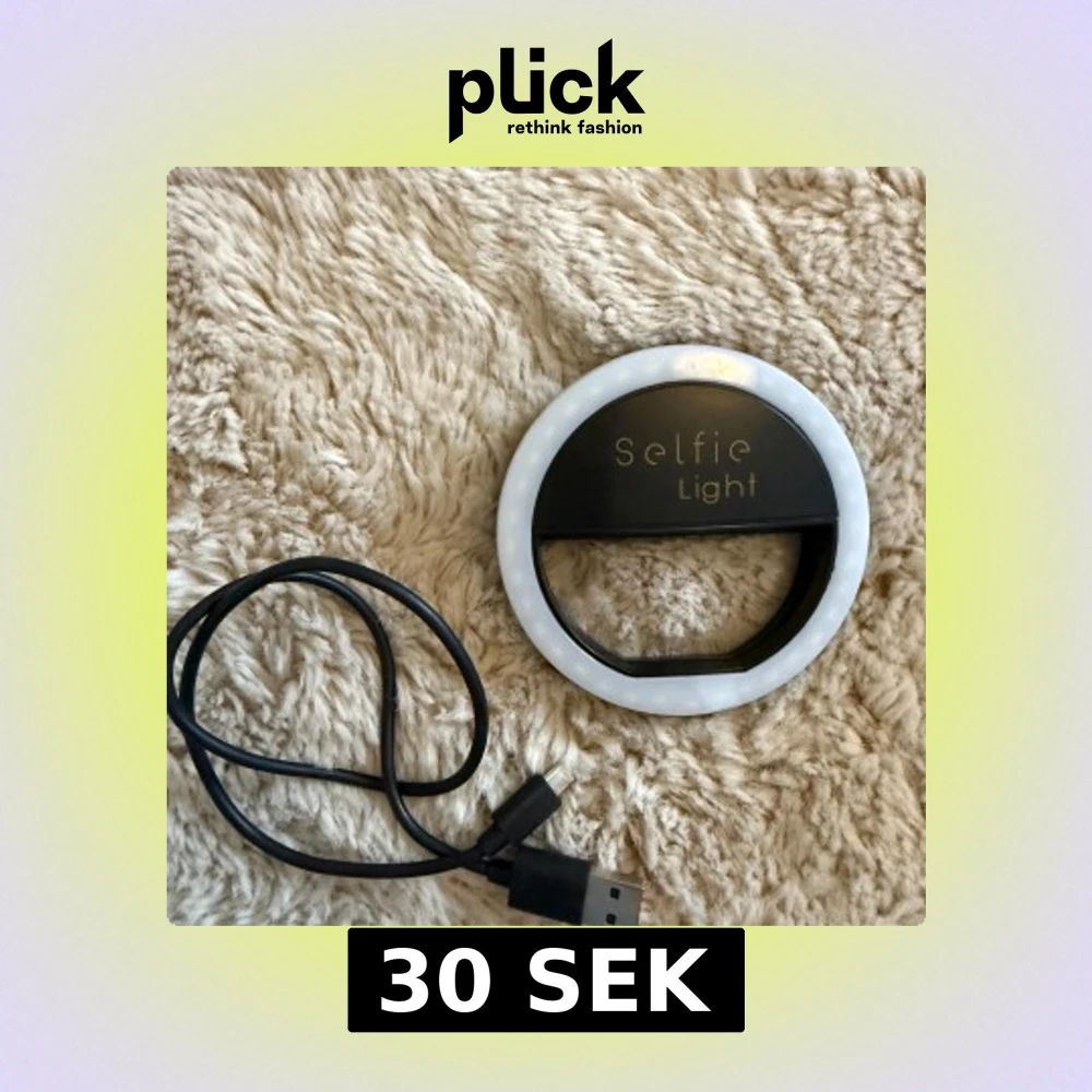 Selfie Light ringlampa i svart och vitt, perfekt för att få flawless ljus till selfies eller sminkvideos. Laddas med USB- c, vilket tillkommer. Har en klämma som går att sätta fast ovanpå telefonen.