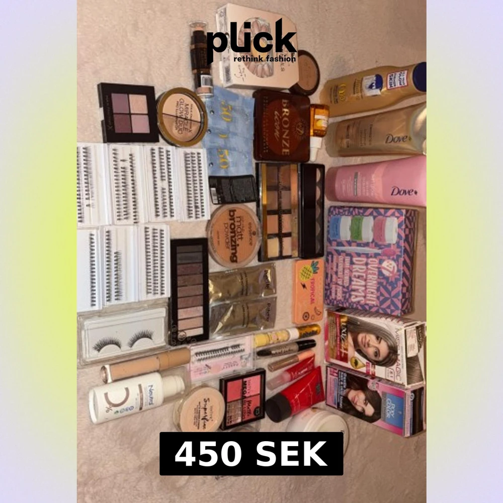 Säljer ett stort sminkpaket med flera ögonskuggspaletter i rosa, lila och nude toner, bronzer, highlighter, foundation balm, concealer, rouge, matt puder, läppglans, läppbalsam och mängder av lösögonfransar i olika stilar. Märken som Max Factor, Technic, Essence och W7. Perfekt för dig som älskar att testa nya looks! Säljer allt detta för 450kr vissa grejer är helt nya o oöppnade kommer inte till användning 💕