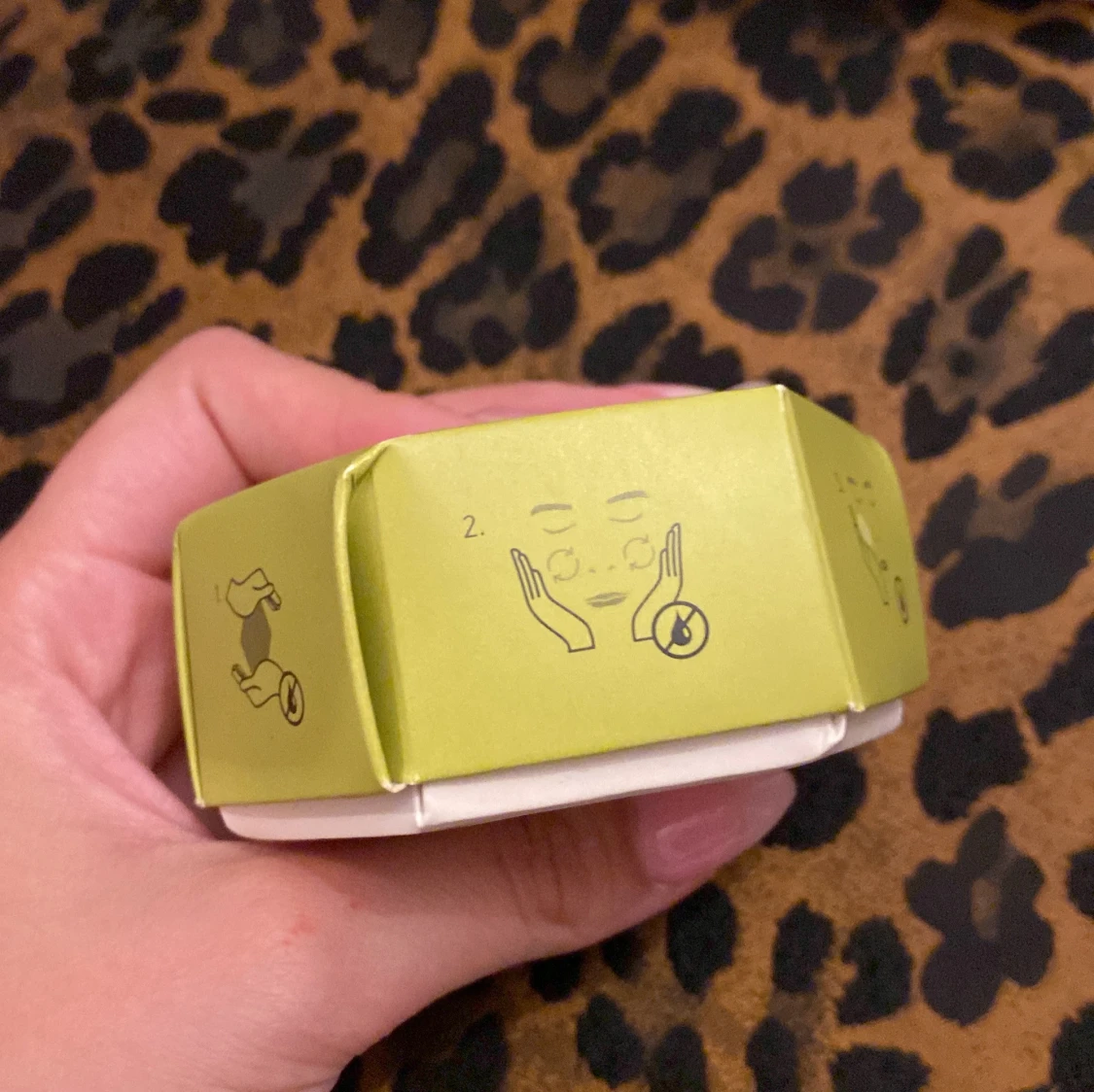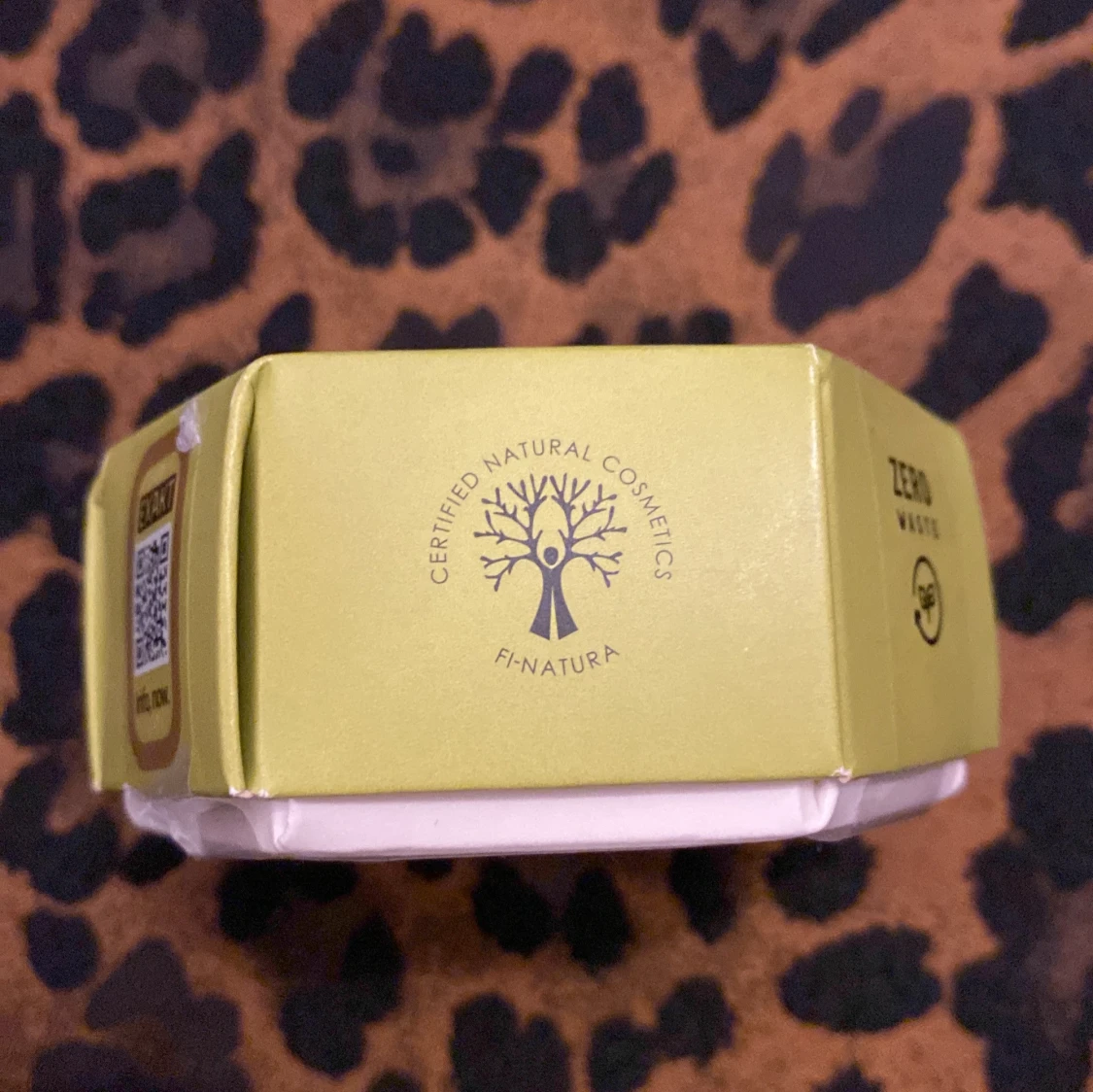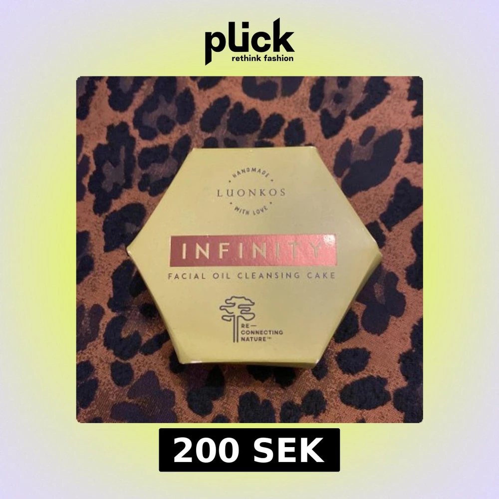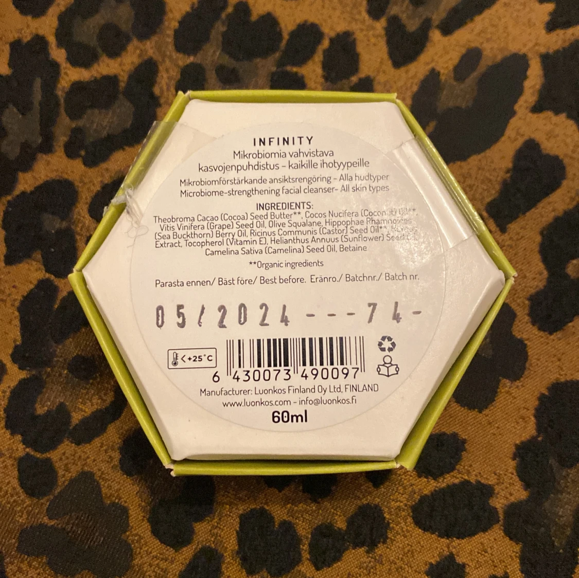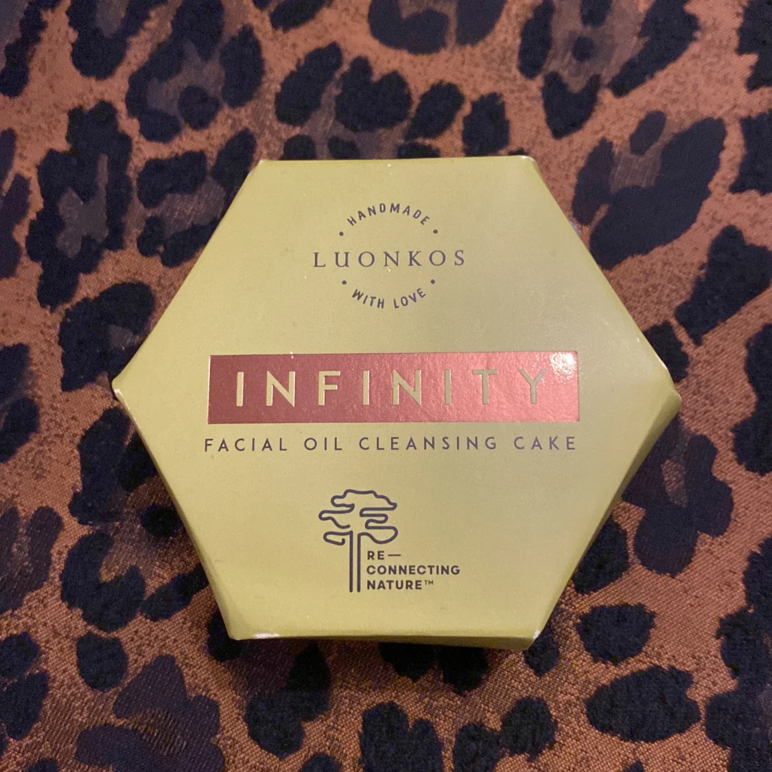 Luonkos Infinity Facial Oil Cleansing Cake är en ansiktsrengöring i fast form, 60 ml, med naturliga oljor som kakao, kokos och druvkärna. Kommer i en sexkantig ljusgul kartong. Certifierad naturlig kosmetik och zero waste.