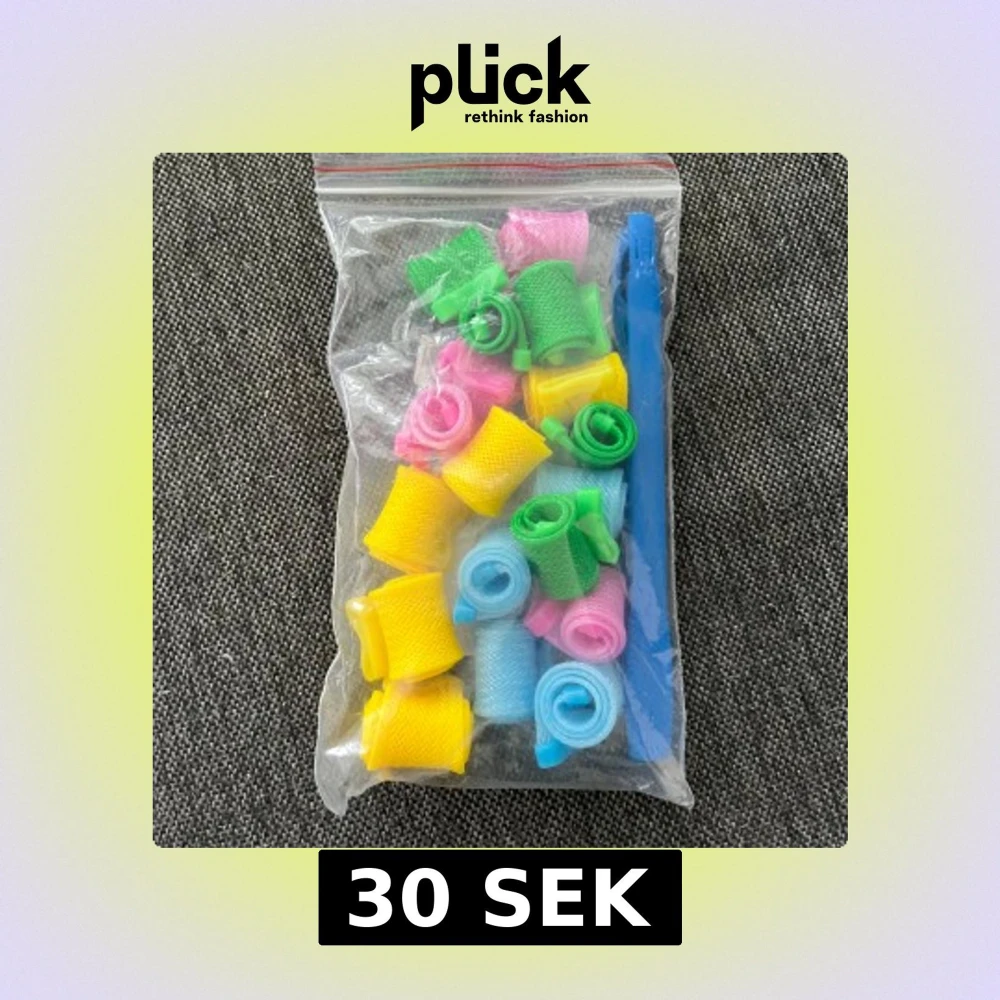 Säljer ett set med hårspolar i plast i färgerna gul, grön, rosa och blå. Kommer i en genomskinlig zip-påse tillsammans med ett blått verktyg för att applicera spolarna. Perfekt för att skapa lockar utan värme.