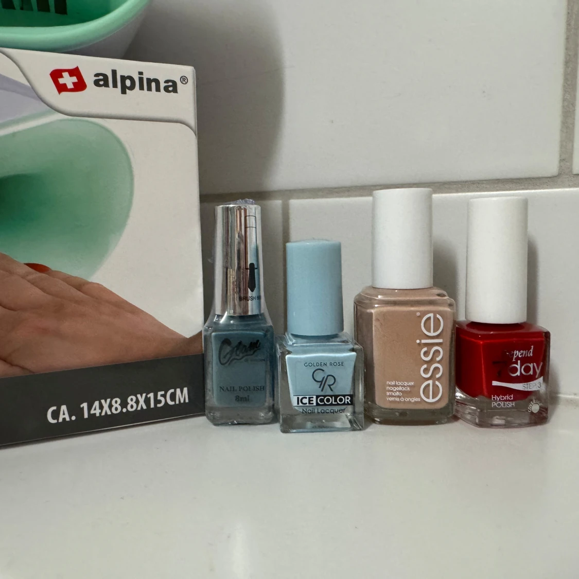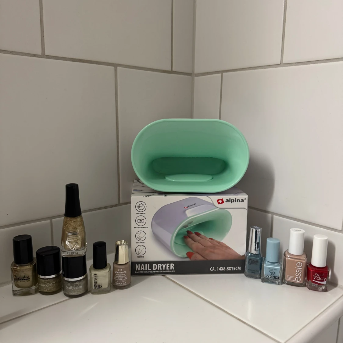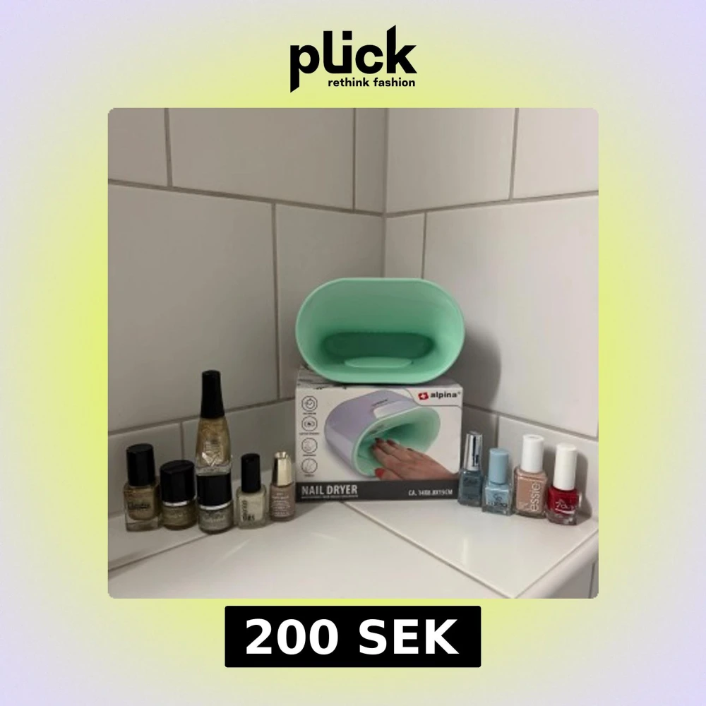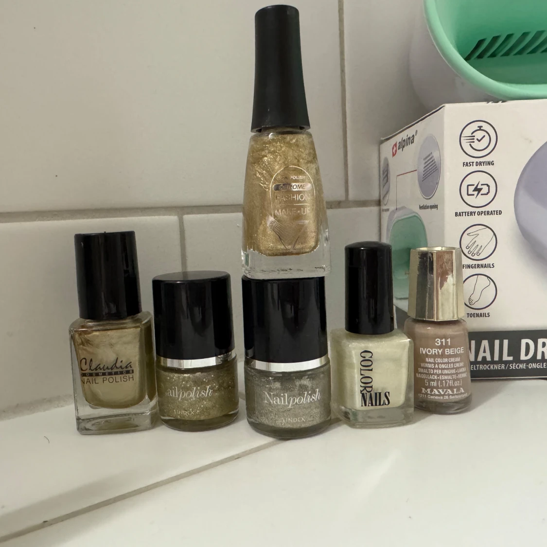 Säljer ett kit med nageltork från Alpina i mintgrönt och flera nagellack i olika färger: guld, silver, beige, blått, rött och nude. Märken som Essie, Mavala, Golden Rose, Depend och fler. Perfekt för dig som vill fixa snygga naglar hemma med både metallic och klassiska nyanser.
