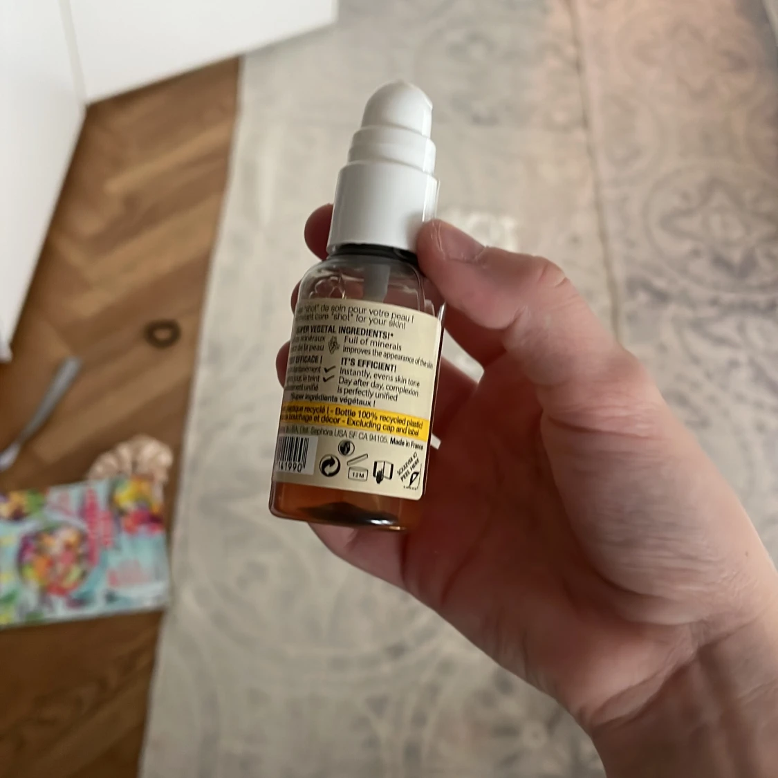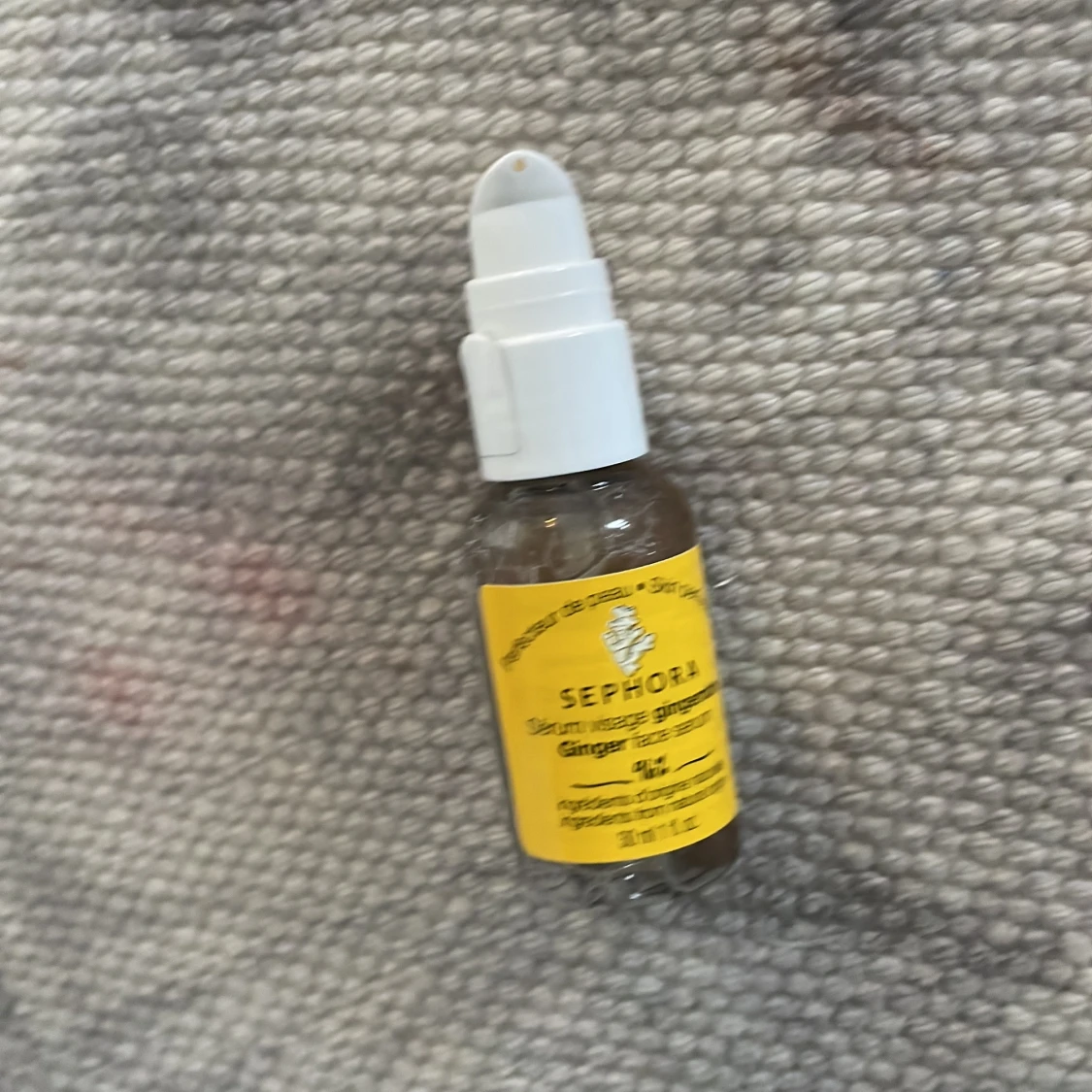 Sephora Ginger Face Serum med pumpflaska, 30 ml. Serumet har en fräsch gul etikett och genomskinlig flaska med vitt lock. Innehåller ingefäraextrakt och är perfekt för att ge huden glow och jämnare ton. Flaskan är tillverkad av återvunnen plast. Doftar gott