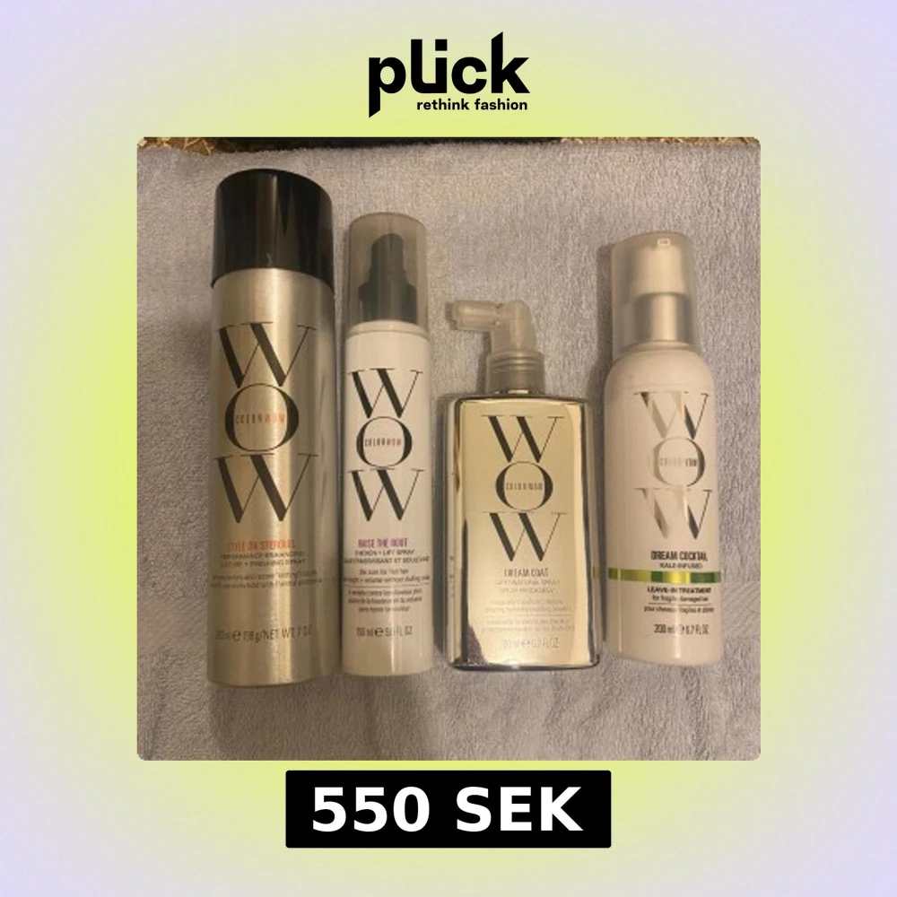 Säljer ett set med fyra hårvårdsprodukter från Color Wow. Inkluderar Style on Steroids, Raise the Root, Dream Coat och Dream Cocktail. Perfekt för att ge volym, glans och skydd till håret. Produkterna kommer i olika storlekar och är designade för att förbättra hårets utseende och känsla. Alla för 550kr