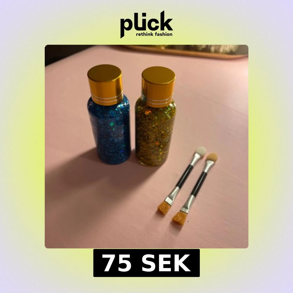 Två flaskor med chunky glitterögonskugga i blått och guld, perfekt för kreativa sminkningar. Kommer med två dubbelsidiga applikatorer, ena sidan med borste och andra med svamp. Flaskorna har snygga guldiga lock och rymmer mycket produkt.