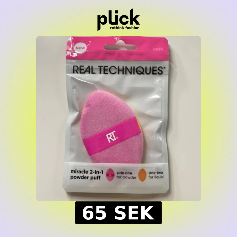 Miracle 2-i-1 powder puff från Real Techniques med en rosa sida för puder och en orange sida för flytande smink. Puffen har en squishy silikon-kärna och ett rosa band med RT-logga för extra kontroll. Perfekt för att blanda foundation, concealer och puder.