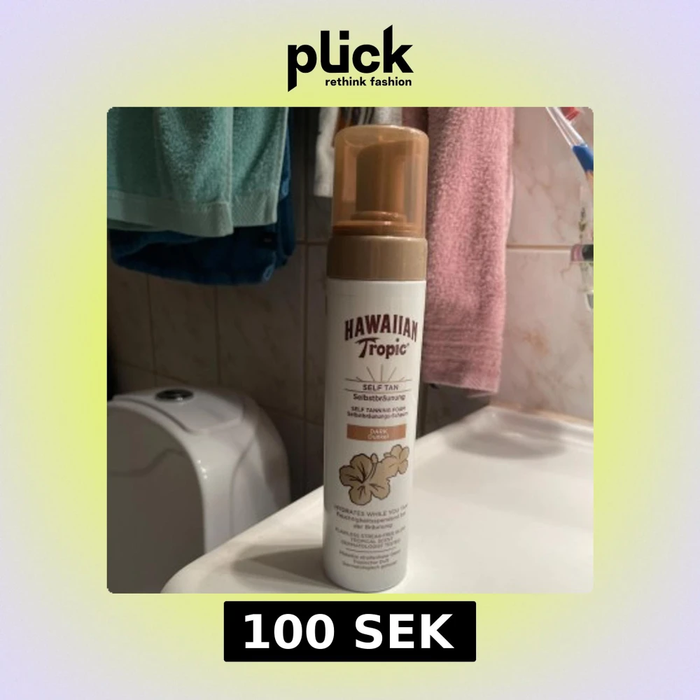 Säljer en flaska med Hawaiian Tropic Self Tan Mousse i nyansen Dark. Denna brun-utan-sol mousse ger en naturlig solbränna och återfuktar huden samtidigt. Perfekt för att få en solkysst look året runt.