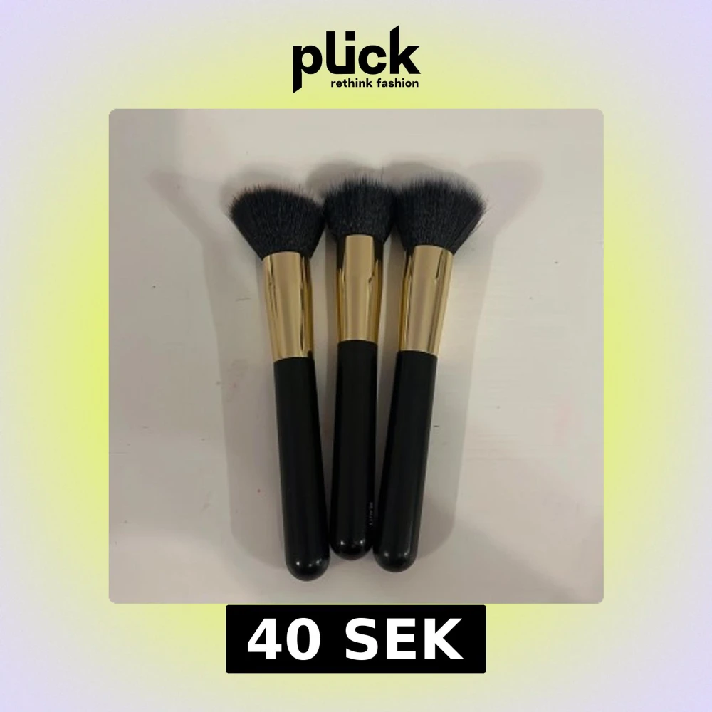 Säljer ett set med tre sminkborstar med svarta handtag och guldfärgade detaljer. Borstarna har mjuka, täta borst i olika former för applicering av smink. Perfekt för både nybörjare och proffs. En sminkborstän är lite använde, men de två andra är helt oanvända.Men även om den ena är lite använd funkar den lika bra.