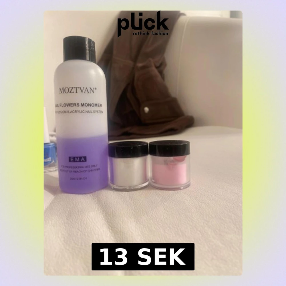 Säljer ett akryl nagelkit från MOZTVAN med en lila monomer (75 ml) och två burkar akrylpulver i vitt och ljusrosa. Perfekt för att skapa snygga och hållbara naglar hemma. Allt kommer i praktiska plastburkar med svarta lock.