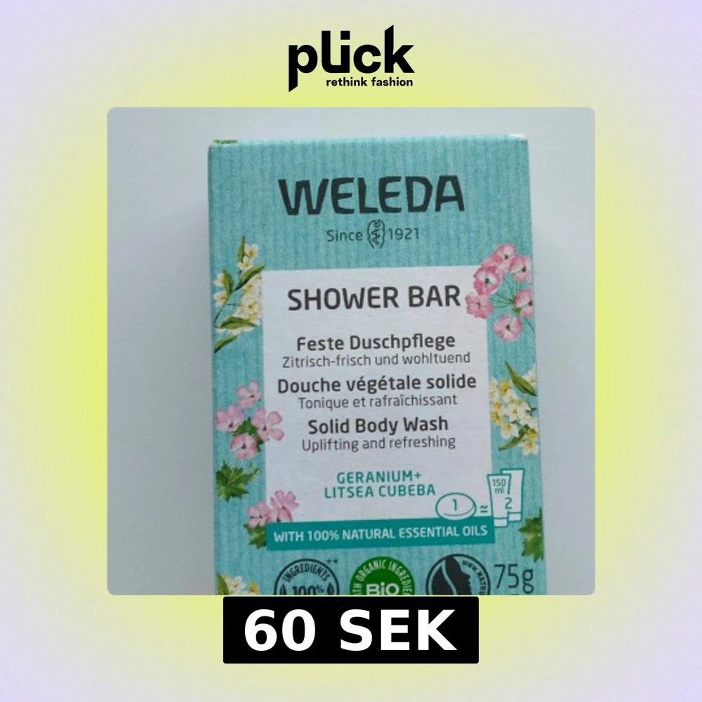 Fast duschtvål från Weleda med doft av geranium och litsea cubeba. Tvålen är fast, ljusgul och väger 75g. Innehåller 100% naturliga eteriska oljor och sheasmör. Kommer i en turkos kartong med blommönster.