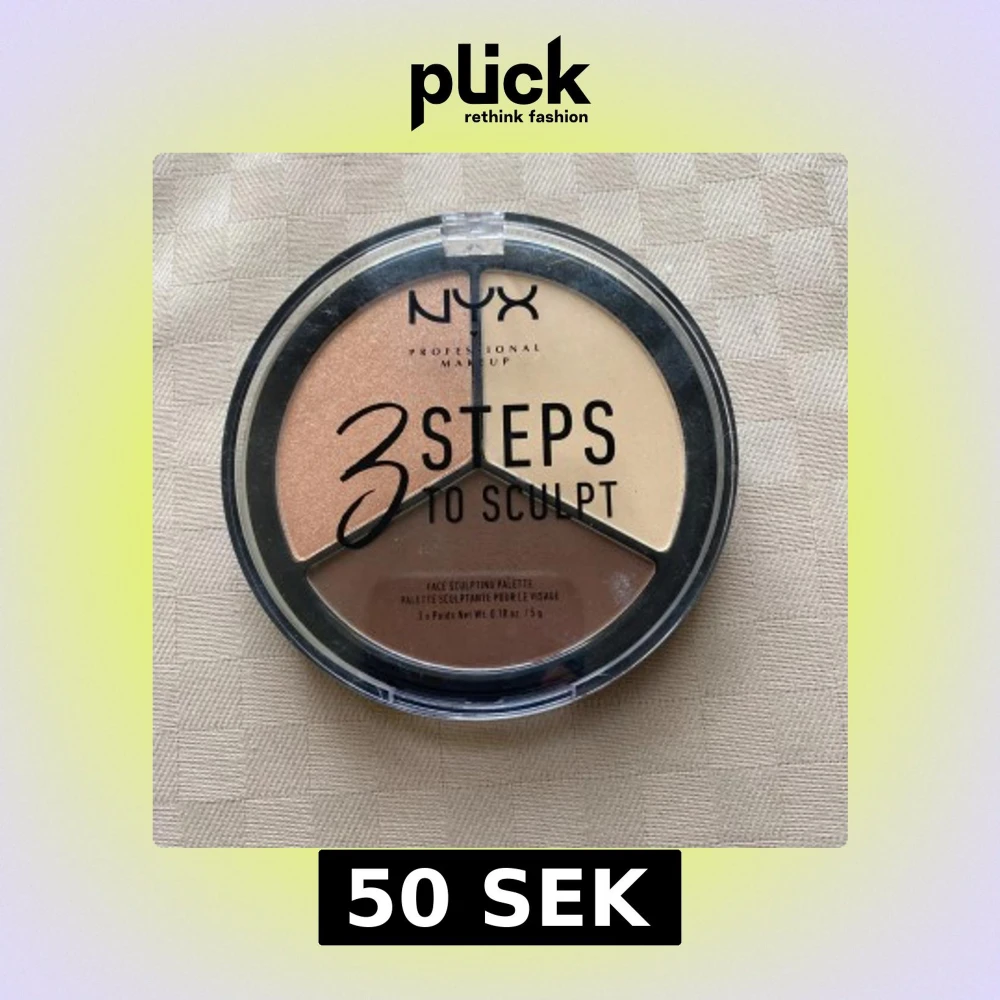 NYX 3 Steps to Sculpt är en ansiktspalett med tre nyanser: en skimrande highlighter i champagne, en matt ljus puder och en matt brun contour. Perfekt för att skulptera och framhäva ansiktet. Rund dosa med genomskinligt lock. Använd en gång.