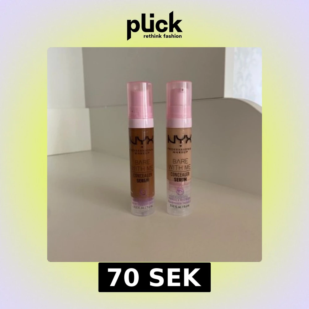 Två concealer serum från NYX Bare With Me-serien med pumpflaska och rosa lock. Nyanserna är 'Camel' och 'Vanilla'. Perfekt för att täcka ojämnheter och ge en naturlig finish. Säljer pga fel färg.