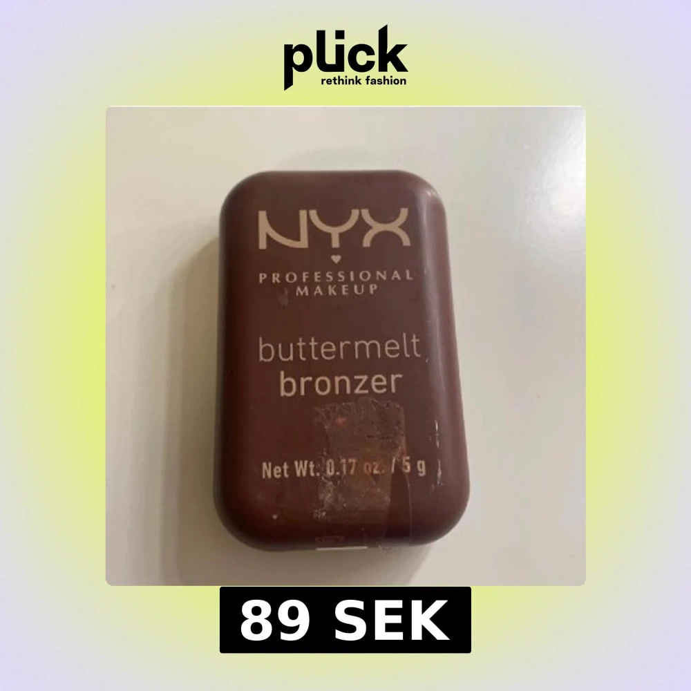 NYX buttermelt bronzer i en kompakt brun förpackning. Pudret har en varm brun nyans med lätt skimrande finish och vågigt mönster i ytan. Perfekt för att skapa en solkysst look och definiera ansiktskonturer.