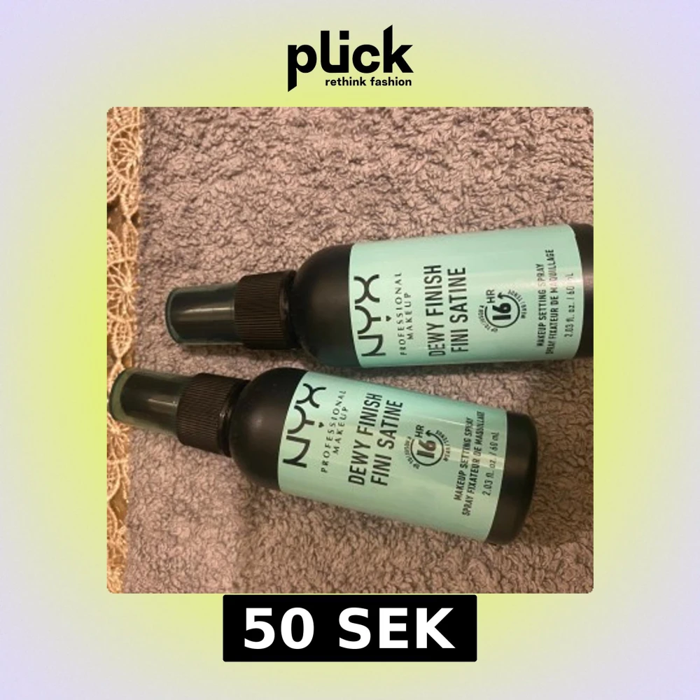 NYX Professional Makeup Dewy Finish Setting Spray ger en fräsch och daggig look som håller i upp till 16 timmar. Perfekt för att fixera sminket och ge en långvarig finish. Flaskan är kompakt och lätt att ta med sig. 50kr båda