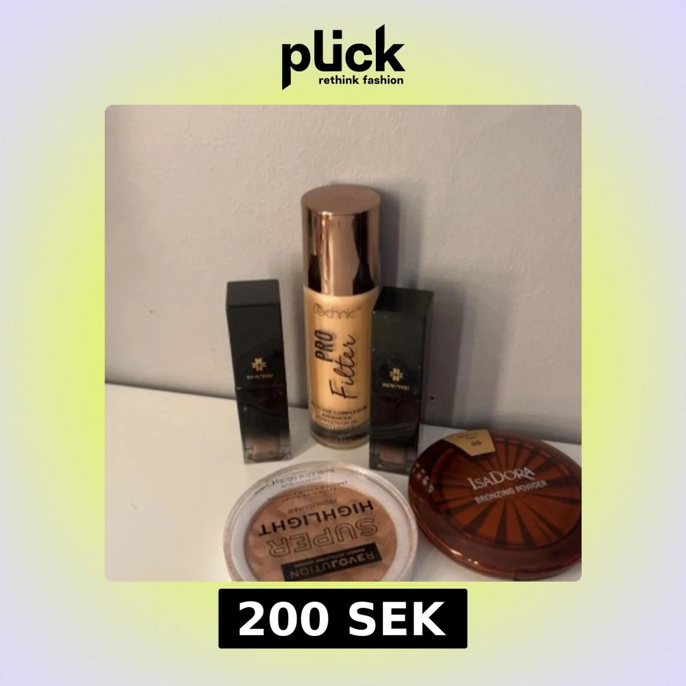 Säljer ett sminkpaket med Technic Pro Filter foundation, IsaDora Bronzing Powder i nyans 49, Revolution Super Highlighter i champagneguld och två Dew You flytande ögonskuggor/highliter i skimrande nude/rosé. Perfekt för dig som gillar glow och bronzig look. Man kan plocka ut med helst köpa hela. Bronzern är använd 1-2 ggr samma med foundation och luqid highlitern, puder highlitern är använd 5-10 men syns ej