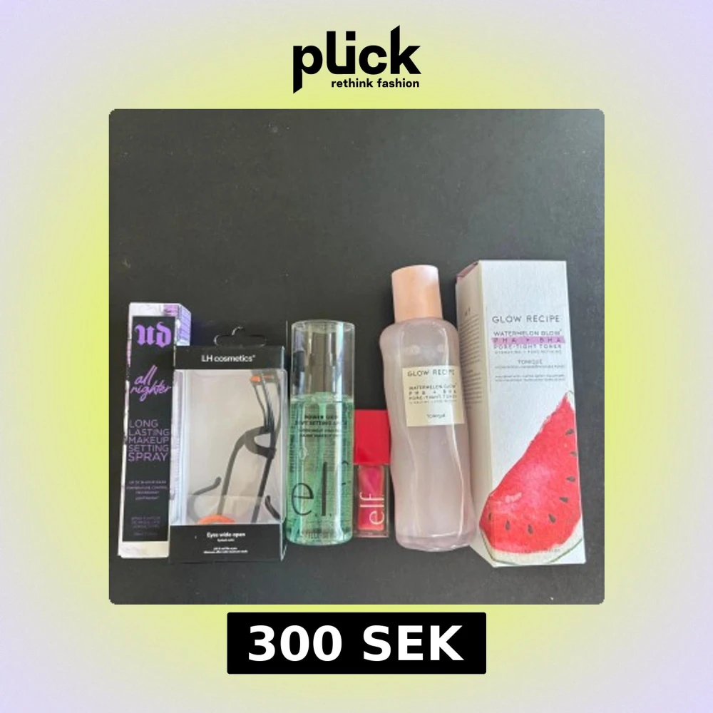 OBS LÄS VAD SOM FINNS KVAR!!!! Säljer flera produkter. Allt är oanvänt förutom glow recipe tonern som är testad 2 gånger. Glow recipe toner 100 kr (köpt för 550 kr på cultbeauty). SÅLD. All nighter settingspray liten 75 kr. SÅLD. Elf settingspray 65 kr. LH cosmetics ögonfransböjare 70 kr. SÅLD. Elf läppglans limited edition köpt i USA och finns inte i Sverige, 30 kr. Allt för 300 eller egna förslag. Andra paket funkar också 🩷(fick endast ha 5 bilder så bild på Elf sprayen är inte med)