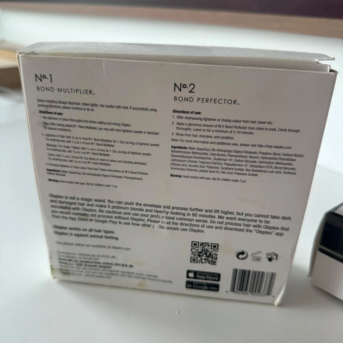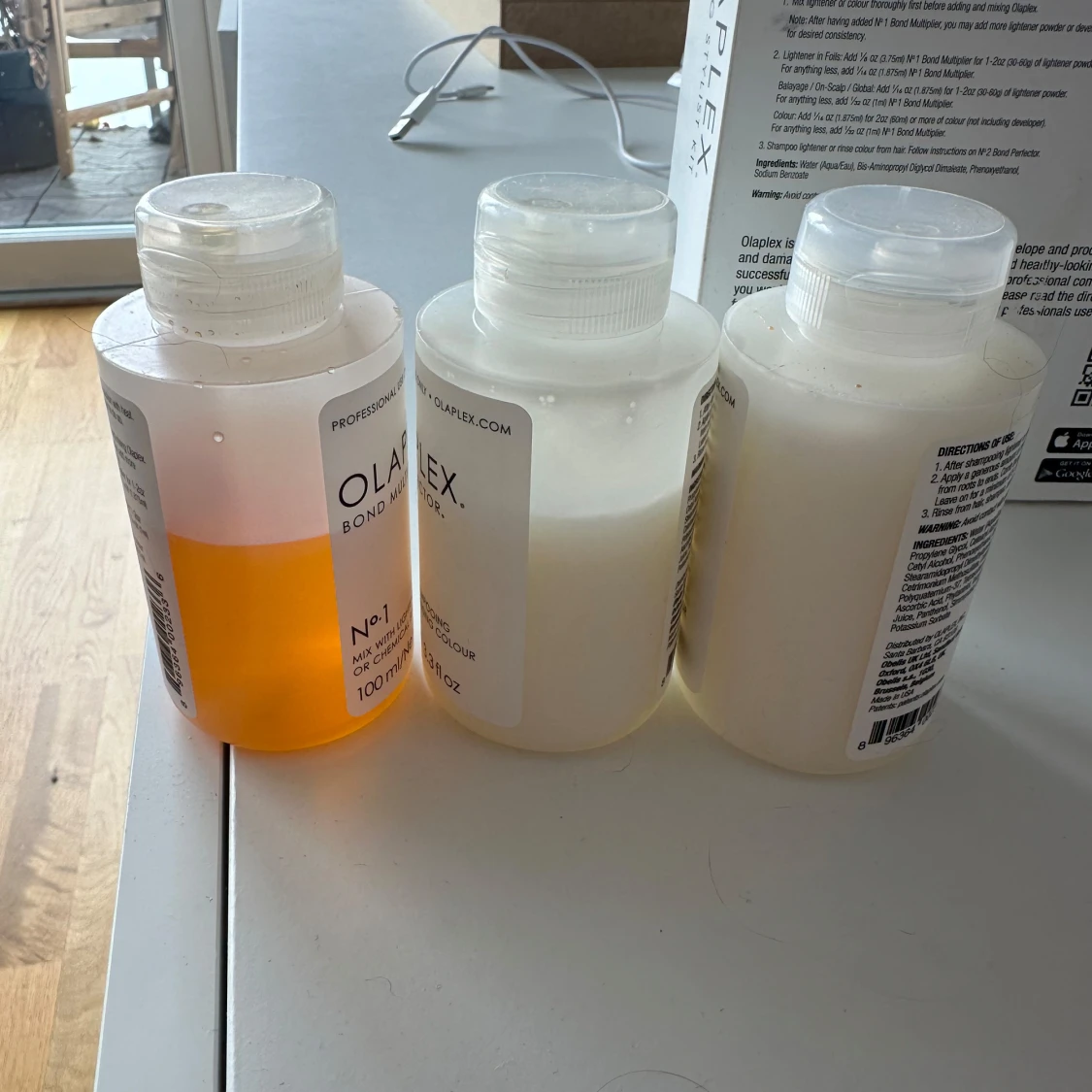 Olaplex Traveling Stylist Kit innehåller No.1 Bond Multiplier och No.2 Bond Perfector i praktiska plastflaskor à 100 ml. No.1 är orangefärgad vätska och No.2 är vit kräm. Perfekt för dig som vill stärka och reparera håret under färgning eller blekning. Ni ser mängd kvar på bilderna. Den längst till höger är plomberad