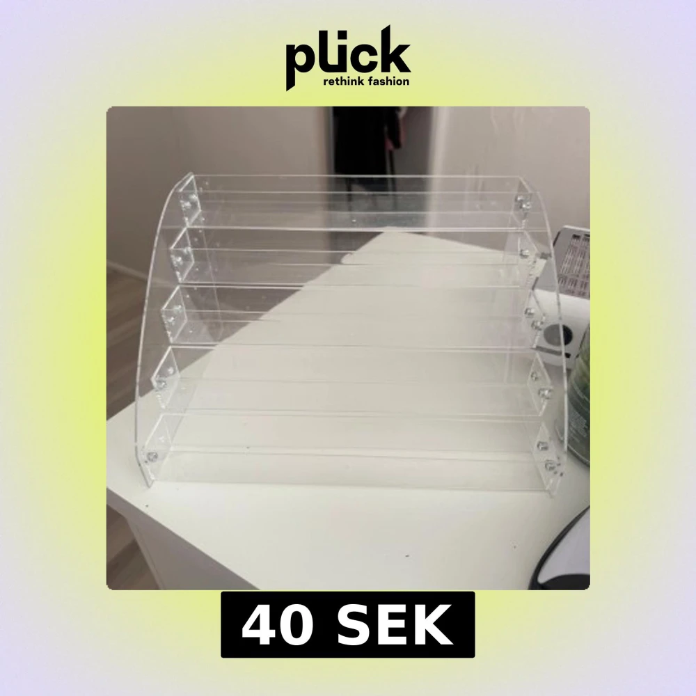 Snygg och praktisk transparent sminkhylla i akryl med flera hyllplan för förvaring av sminkprodukter. Perfekt för att organisera läppstift, nagellack och andra små skönhetsprodukter. Enkel att montera och passar bra på sminkbordet.