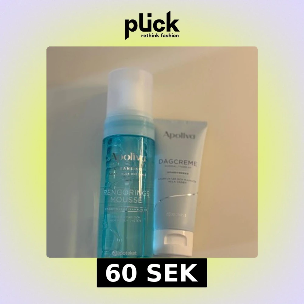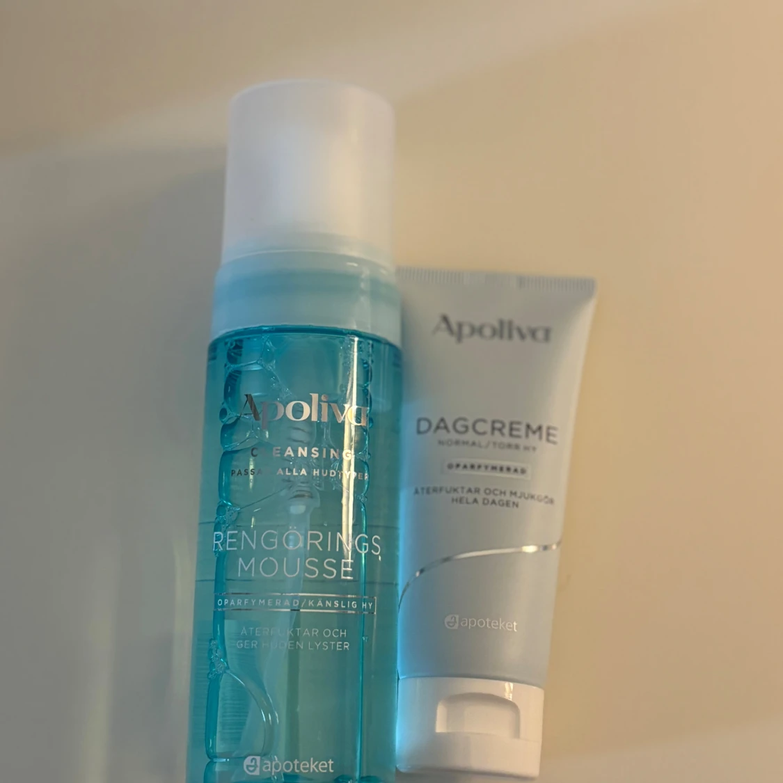 Säljer ett kit med Apoliva rengöringsmousse i blå plastflaska med pump och Apoliva dagkräm i ljusgrå tub. Båda är parfymfria och passar känslig hud. Perfekt för dig som vill ha återfuktad och fräsch hy.