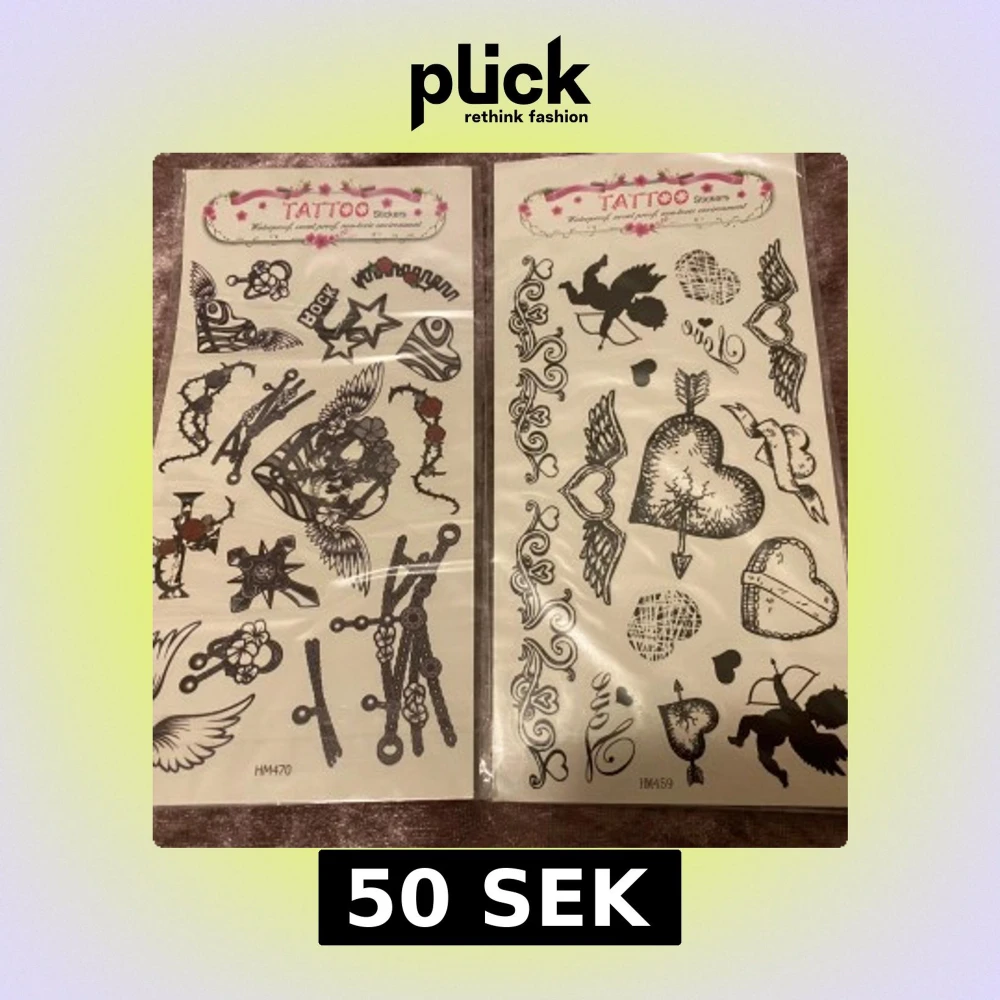 Två ark med tattoo stickers i svart och rött, med motiv som hjärtan, vingar, stjärnor, amor, rosor och kedjor. Perfekt för att skapa en edgy look med tillfälliga tatueringar. Motiven är detaljerade och varierar mellan romantiska och rockiga stilar.