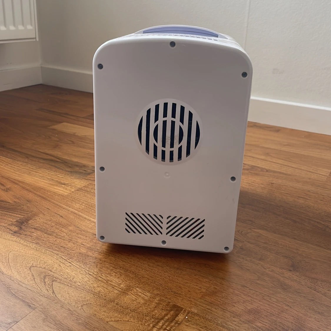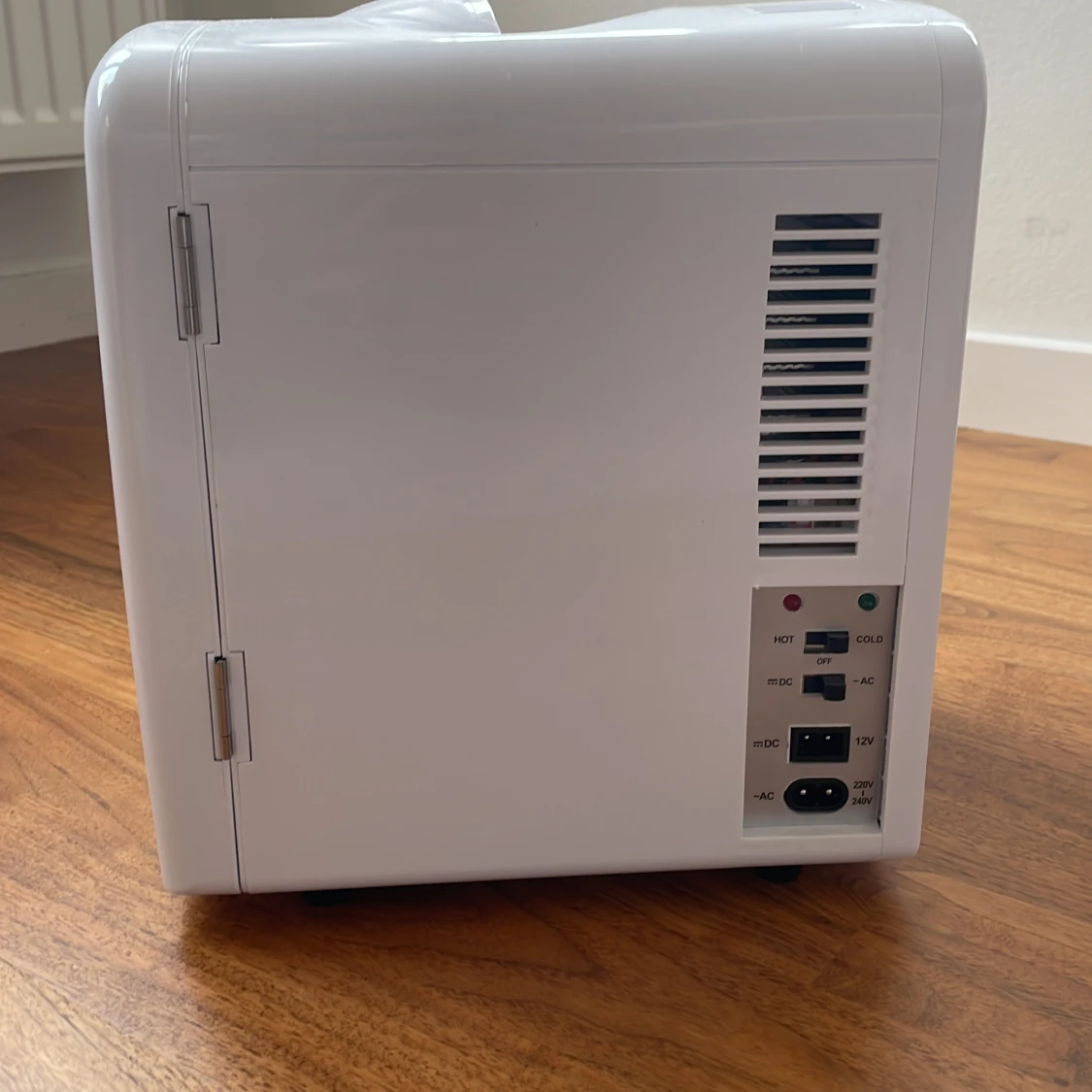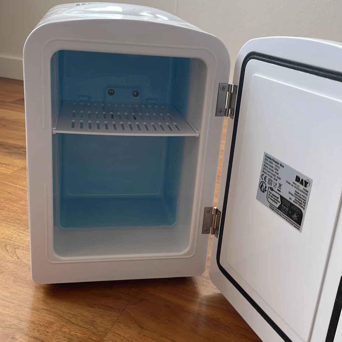Snyggt och kompakt sminkkylskÄp i vit plast med blÄ insida. Perfekt för att förvara dina hudvÄrdsprodukter och smink sÄ de hÄller sig frÀscha lÀngre. Har hylla för extra förvaring och kan bÄde kyla och vÀrma. Passar perfekt pÄ sminkbordet.