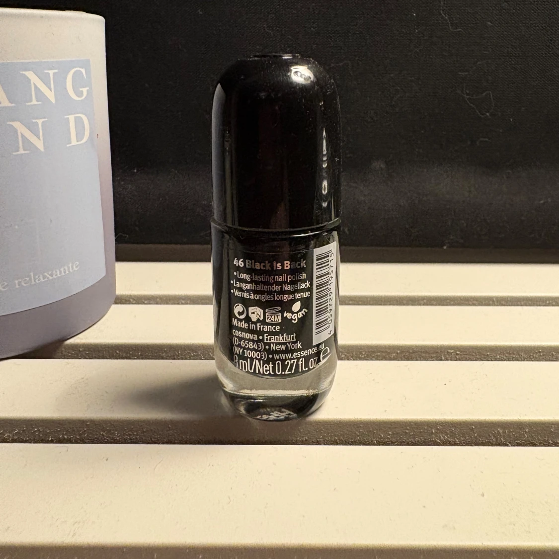 Essence Shine Last & Go gel nagellack i färgen 46 Black Is Back. Djupsvart, glansig finish och vegansk formula. Kommer i en smidig glasflaska med rundad svart plastkork. Perfekt för dig som vill ha riktigt svarta naglar med lång hållbarhet.