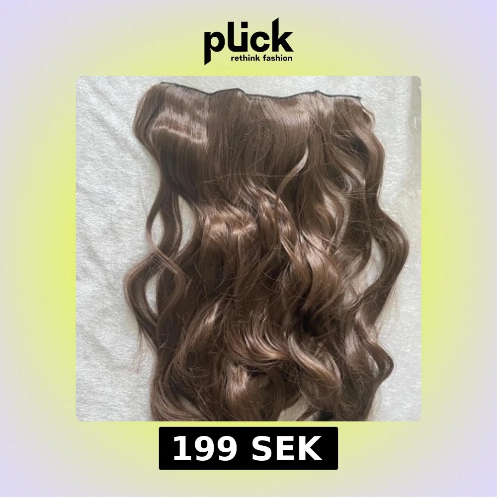 Säljer en vågig hårförlängning i mellanbrun nyans med clips. Håret är syntetiskt och har en naturlig glans. Fästet är gjort av svart spets med flera clips för enkel applicering. Perfekt för att snabbt få längre och fylligare hår. Helt ny