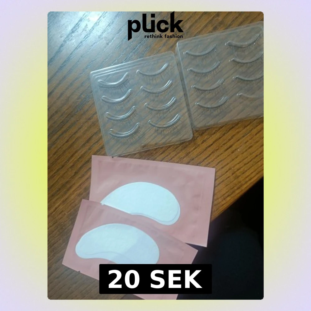 Säljer två förpackningar med naturligt svarta falska ögonfransar i plast samt två rosa förpackningar med vita pads för under ögonen. Perfekt för att skapa en fräsch och definierad look med extra volym till fransarna.