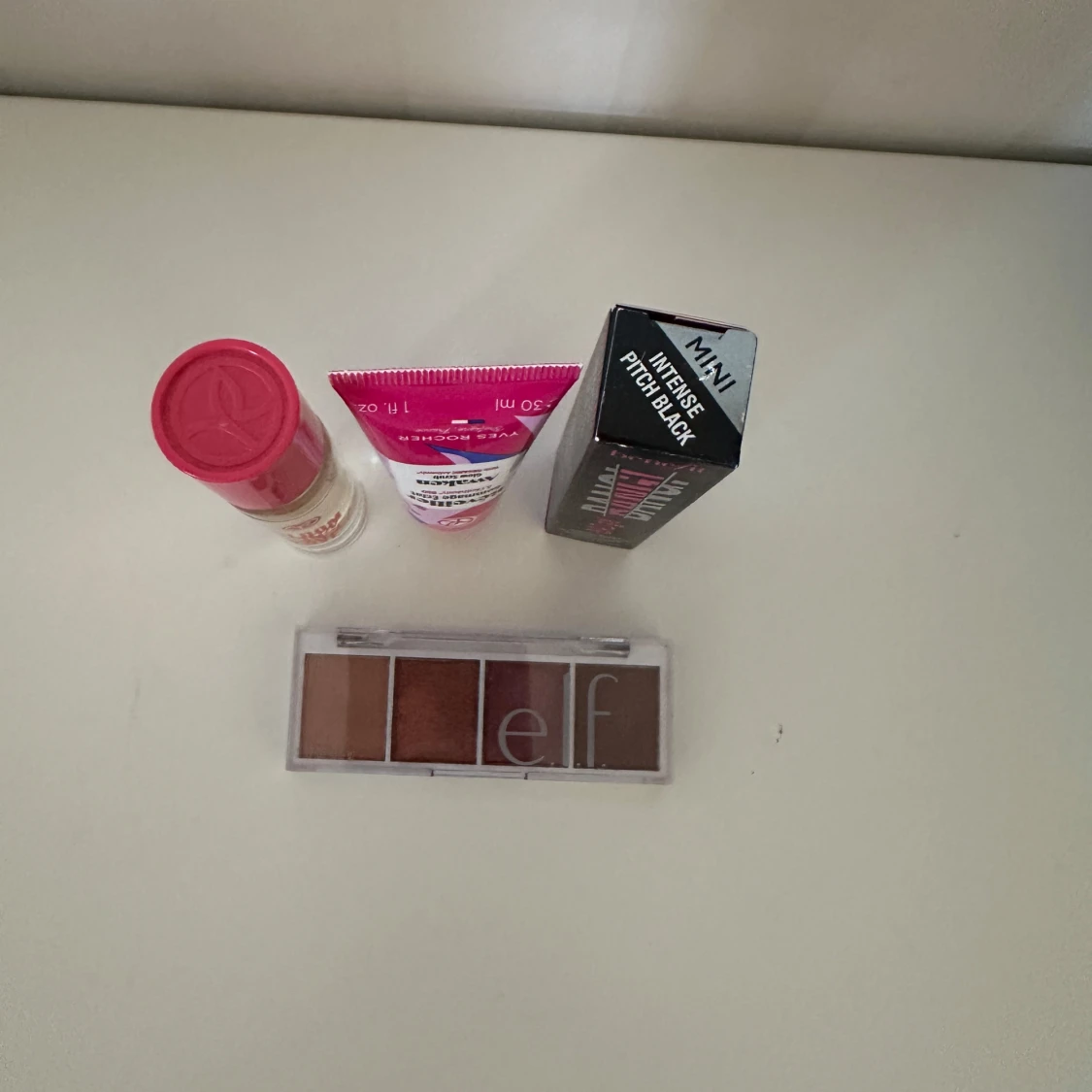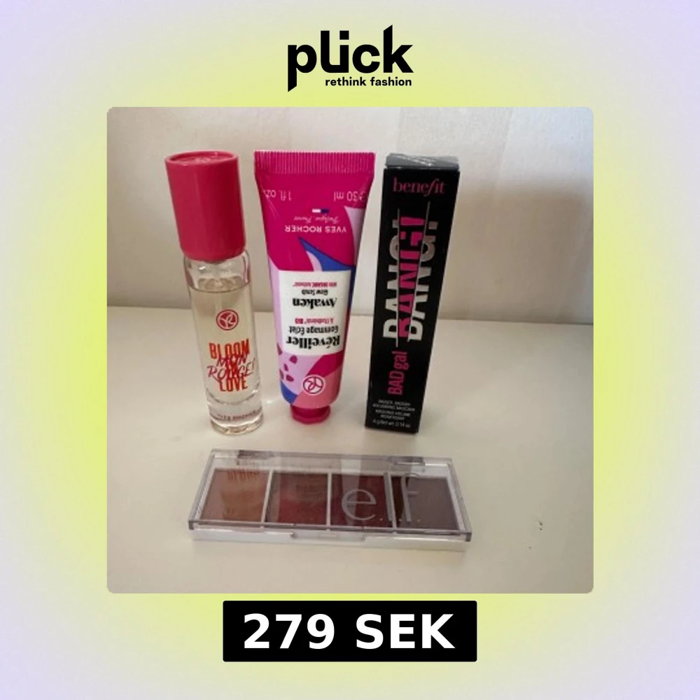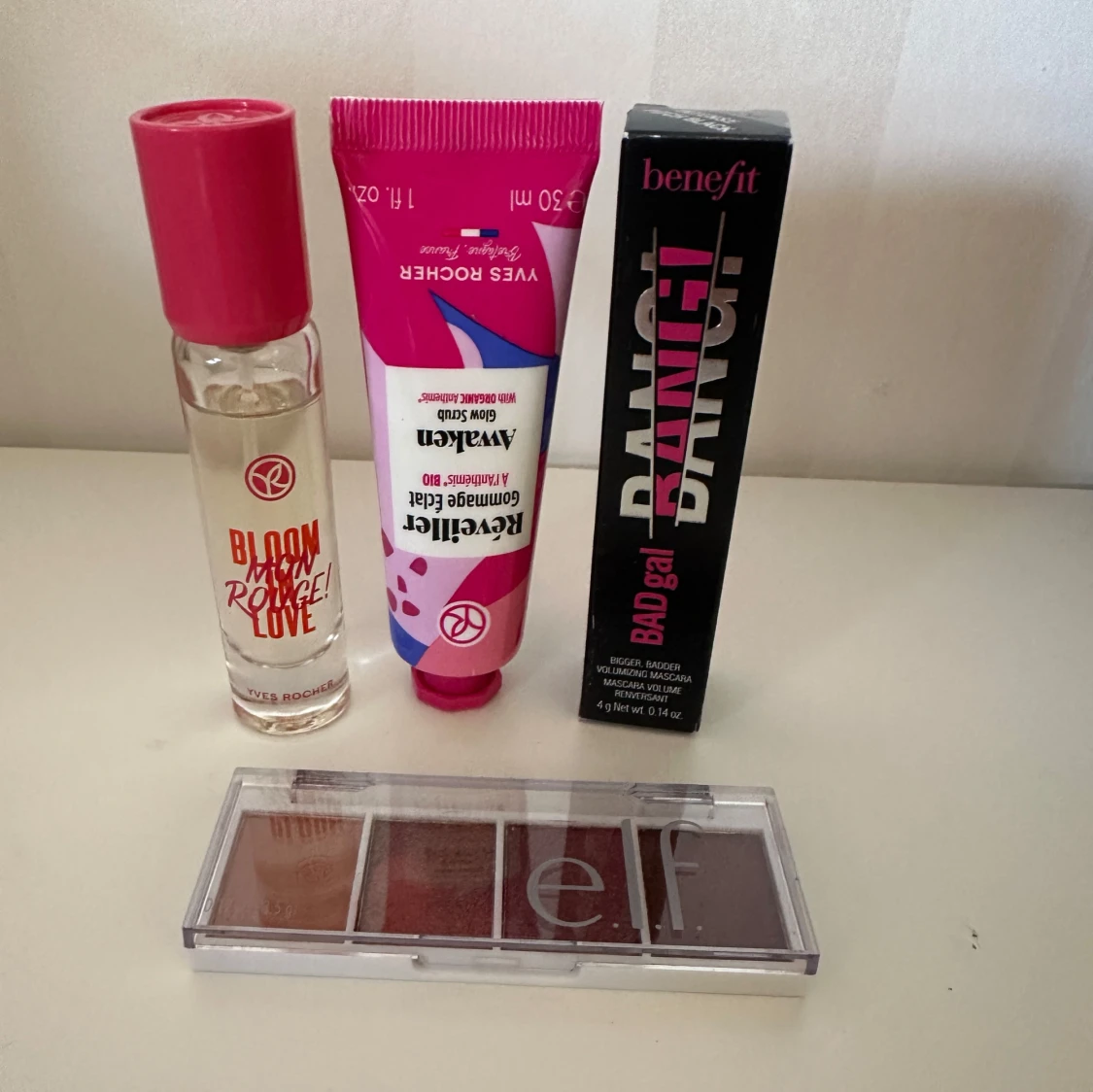 sminkset med Benefit BADgal BANG! mascara för volym, Yves Rocher Eau de parfum, Yves rocher glow scrub och e.l.f. ögonskuggspalett i varma toner. Perfekt för en komplett look!