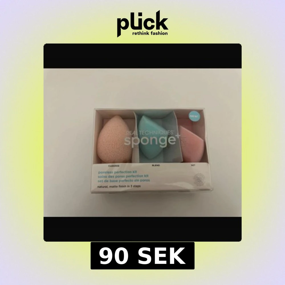 Säljer ett Real Techniques Sponge+ poreless perfection kit med tre olika makeupsvampar. En persikofärgad rengöringssvamp, en ljusblå blending-svamp och en rosa setting-svamp. .