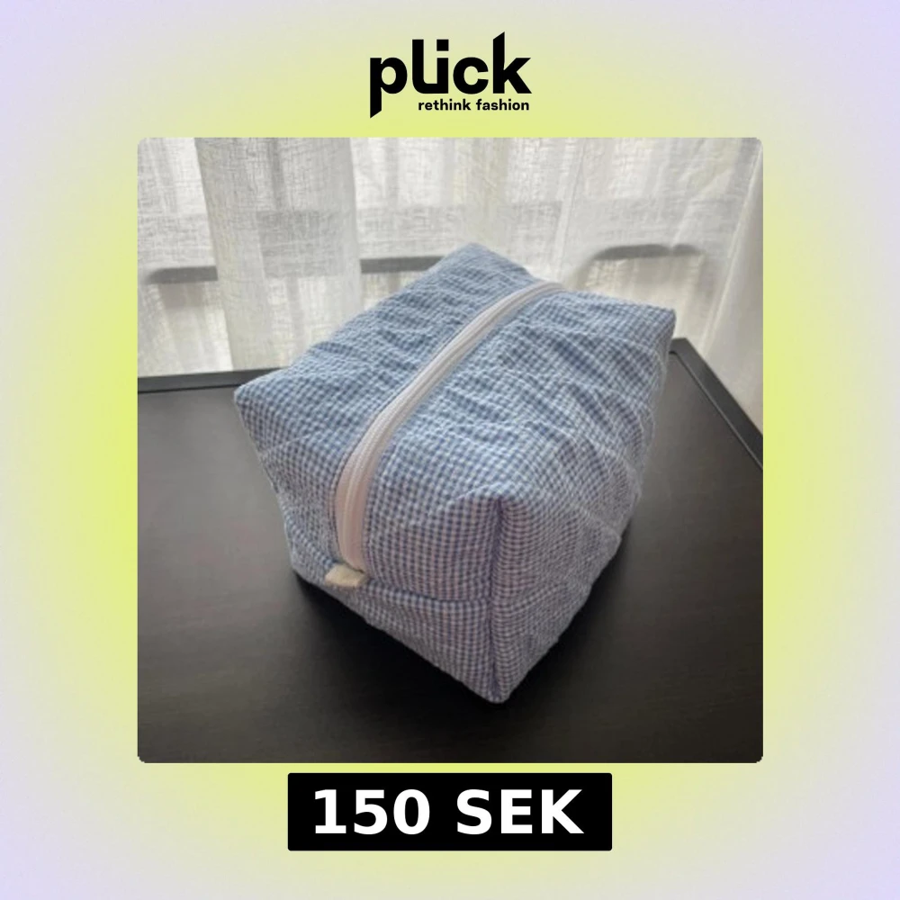 Söt necessär i blåvitt rutigt bomullstyg med vit dragkedja. Insidan är fodrad med vitt tyg och små blå blommor. Perfekt för smink eller småprylar, och den boxiga formen gör den rymlig och lätt att packa ner i väskan. Bredd: 12 Längd: 18 Höjd: 12