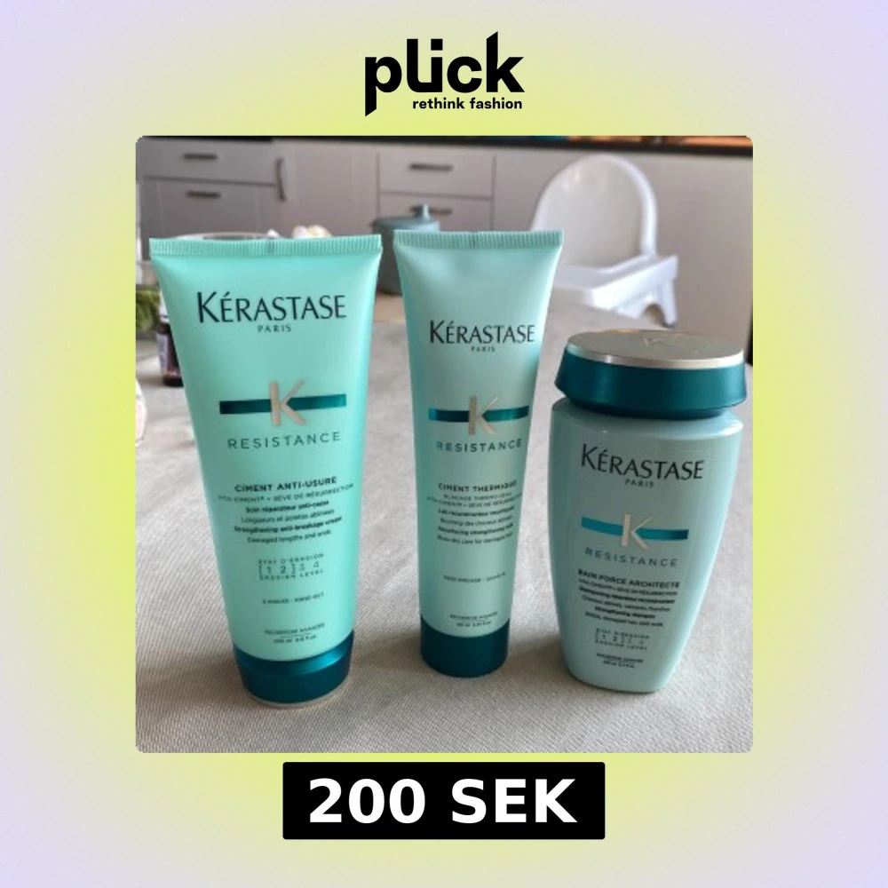 Säljer ett set med Kérastase Resistance: Ciment Anti-Usure (200 ml), Ciment Thermique (150 ml) och Bain Force Architecte schampo (250 ml). Alla produkter är i mintgrön plastförpackning och är perfekta för att stärka och reparera skadat hår. Balsamet är använt en gång och därefter insåg jag att serien inte passade mig.