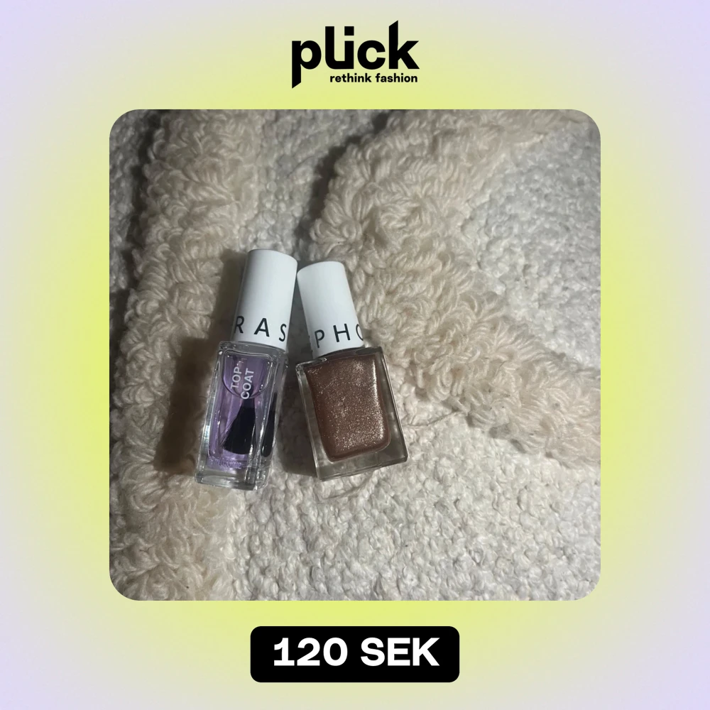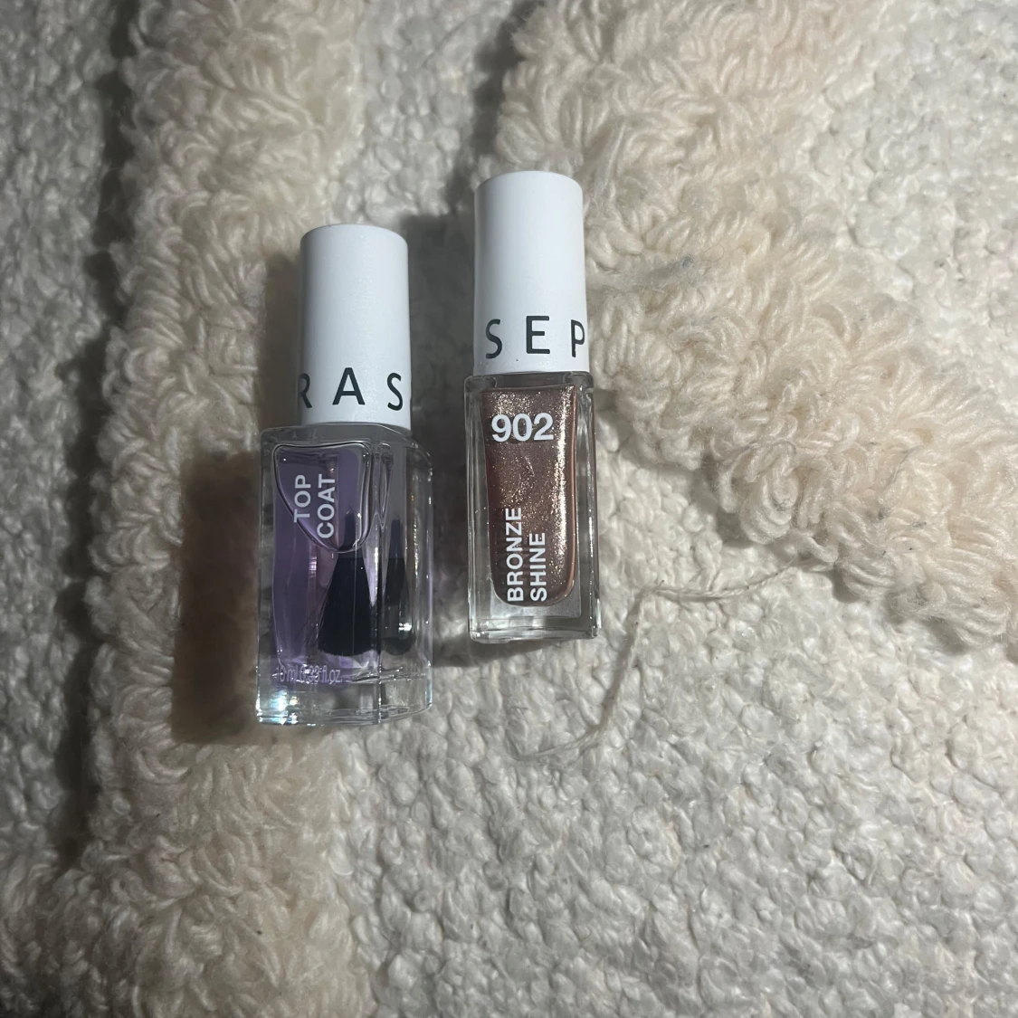 Säljer två nagellack från Sephora. Ett är en top coat för extra glans och hållbarhet, och det andra är i färgen 'Bronze Shine', perfekt för en glittrig look. Perfekt för att ge dina naglar en snygg finish! 120kr för båda. (Top coat orginal pris 109+59 för färgen