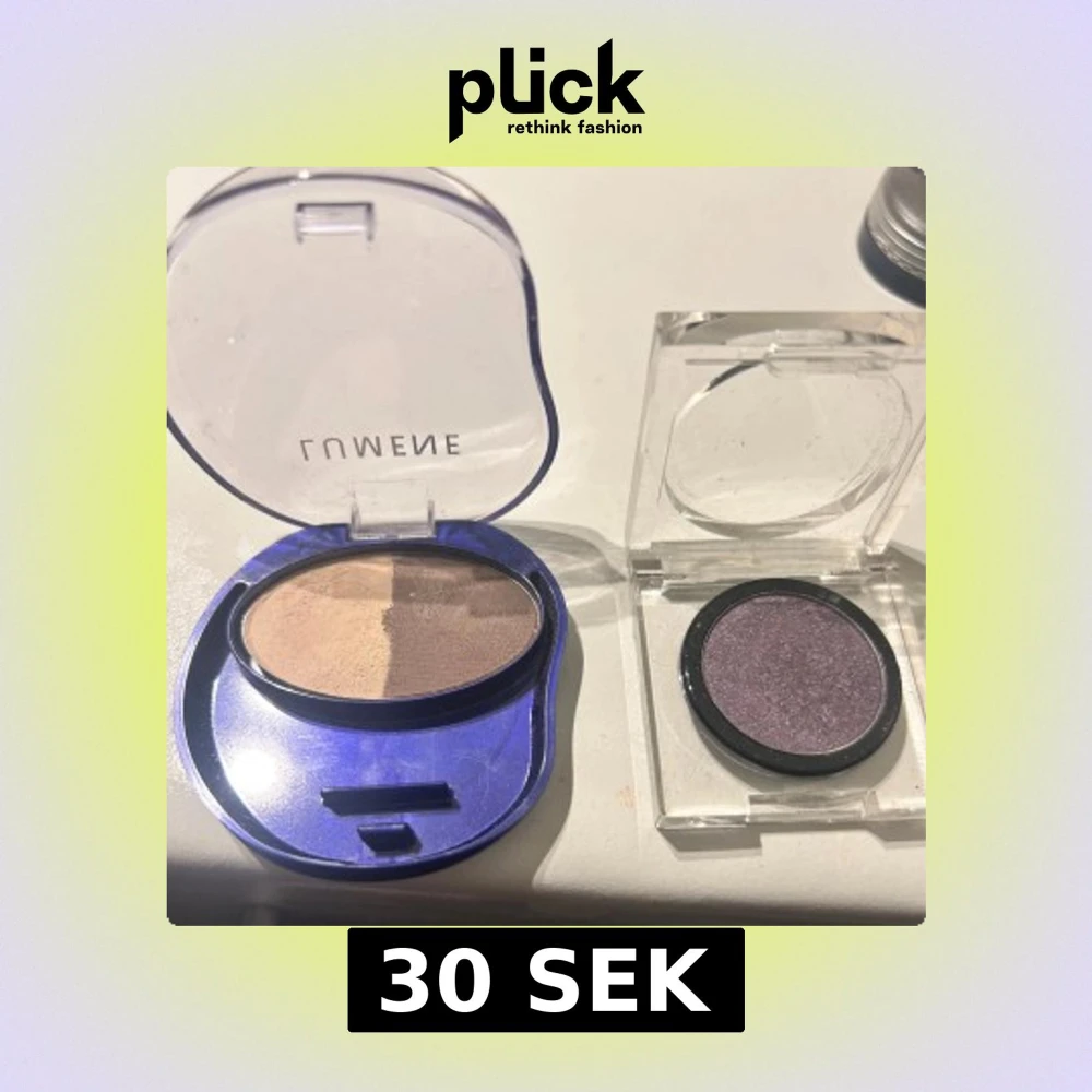 Säljer två ögonskuggor: en Lumene Arctic Duet i nyansen Veil of Mist med två matta bruna toner i oval blå plastförpackning, samt en Invima Eye Focus i färgen 50 Metal Mauve, en skimrande lila singelskugga i transparent ask.