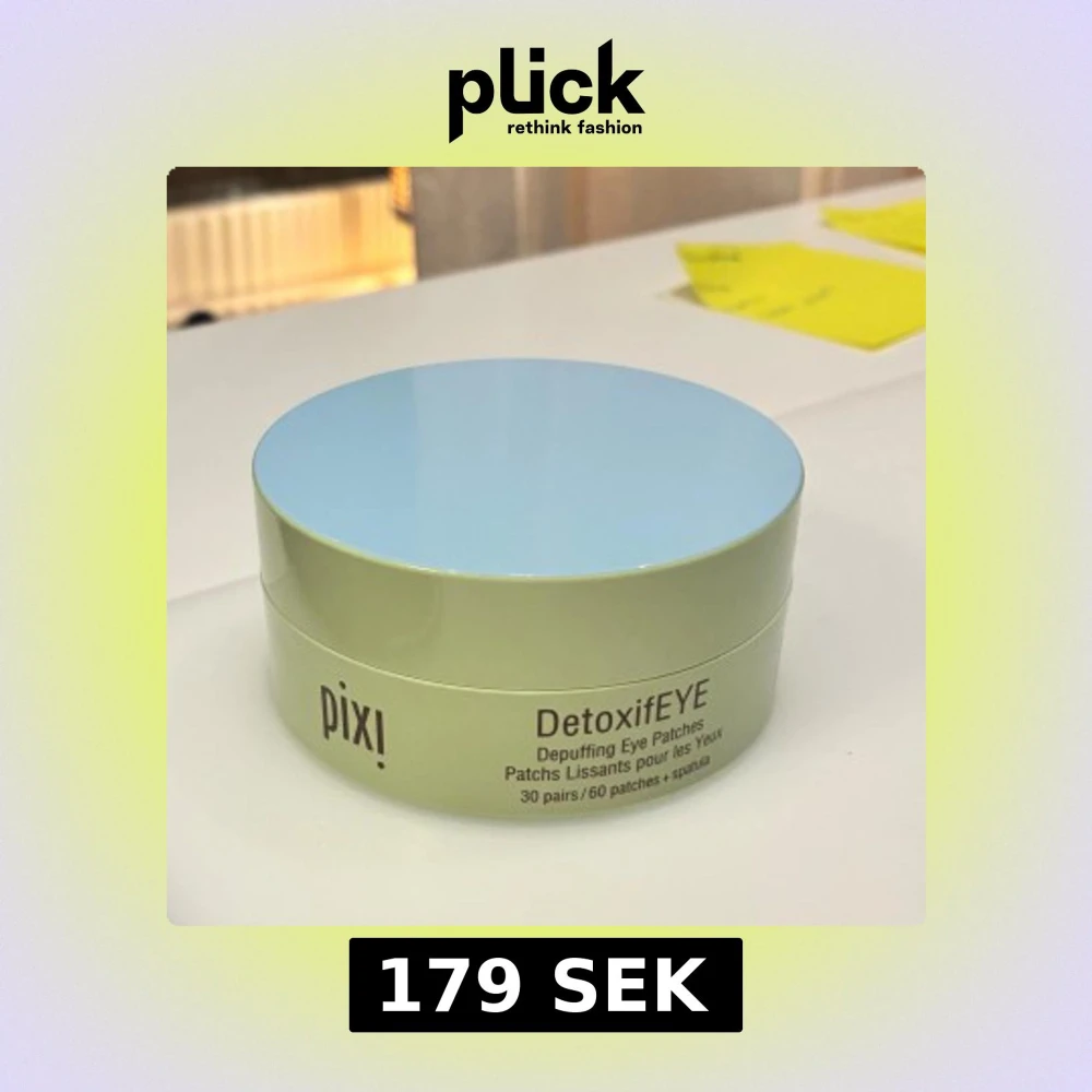 Pixi DetoxifEYE Depuffing Eye Patches kommer i en rund, ljusgrön burk med blått lock. Innehåller 30 par geléaktiga, gröna hydrogelpatches varav 3 par är använda (6 st patches). En spatula nedkommer för applicering. Perfekt för att pigga upp trötta ögon med ingredienser som hyaluronsyra och koffein. Säljer på grund av att jag inte får användning av de. Bra pris för knappt använda eye patches med bra ingredienser, kostar 339 nypris!