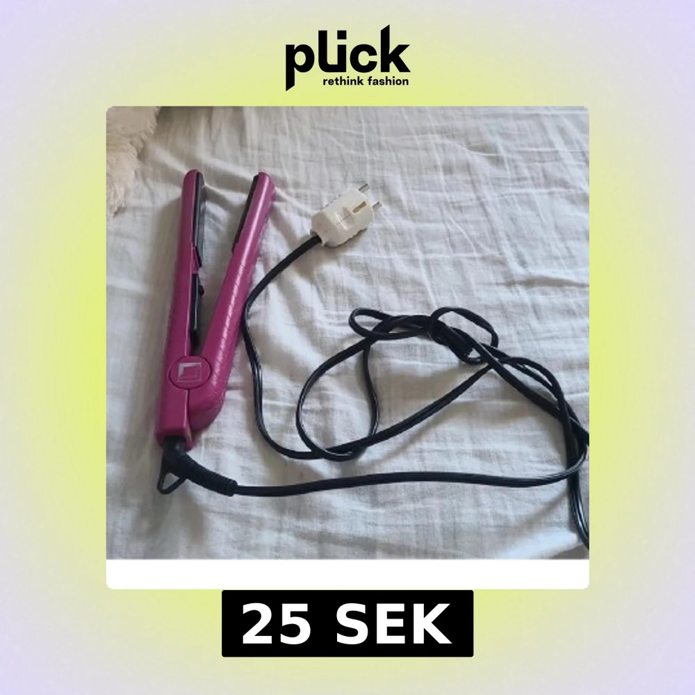 Rosa plattång med svart sladd och EU-kontakt. Ser ut att vara i gott skick utan synliga skador eller slitage. Perfekt för att snabbt och enkelt styla håret hemma. Enkel att använda och värms upp snabbt.