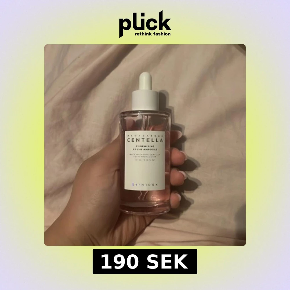 Säljer en Centella Redermizing Fresh Ampoule från Skin1004. Den kommer i en genomskinlig glasflaska med pipett och innehåller en ljusrosa vätska. Perfekt för att återfukta och lugna huden.