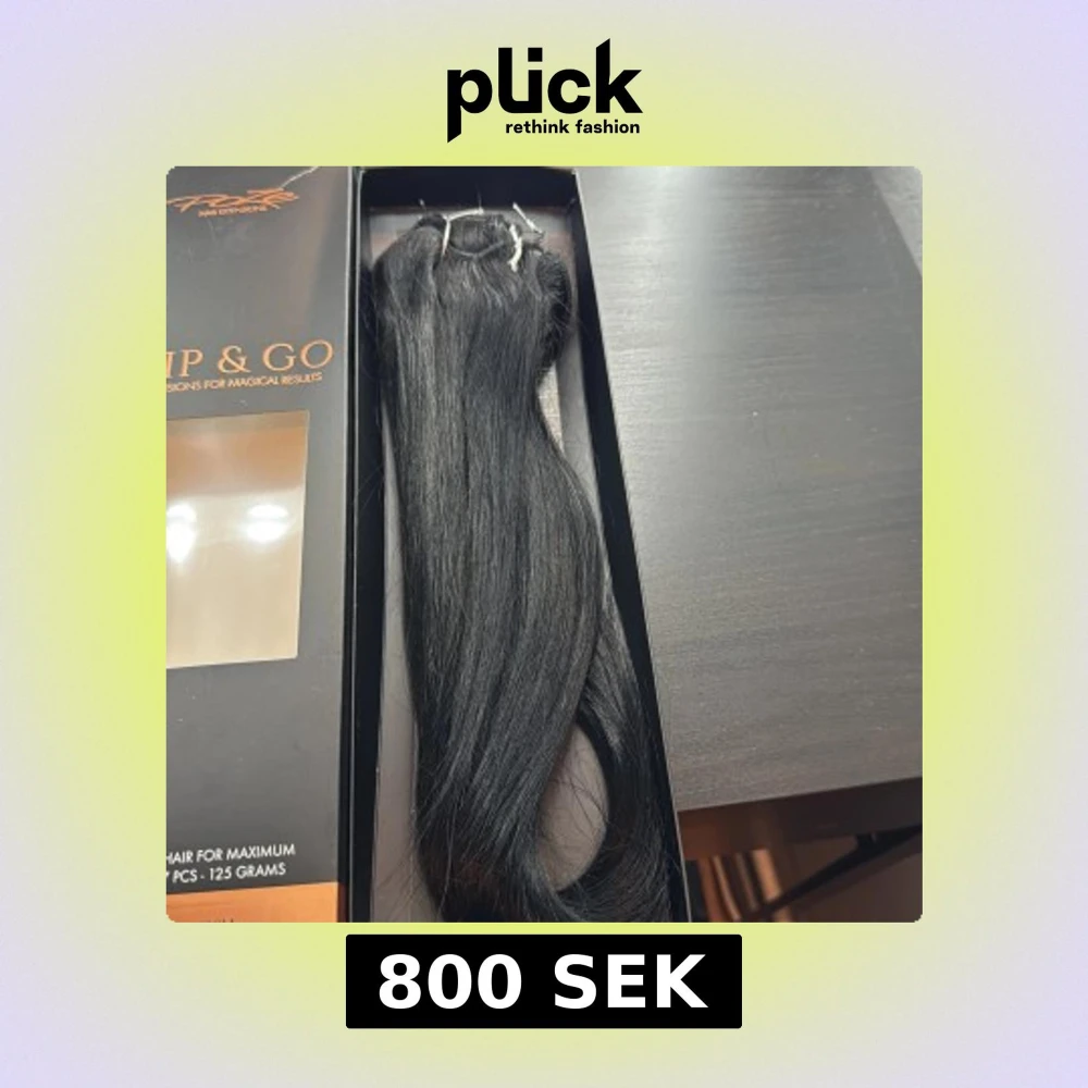 Clip & Go löshår från Poze i en djupsvart nyans. Snyggt, rakt och glansigt äkta hår med clip on i 7 delar. 40cm 100 gram aldrig använt. Nypris 950