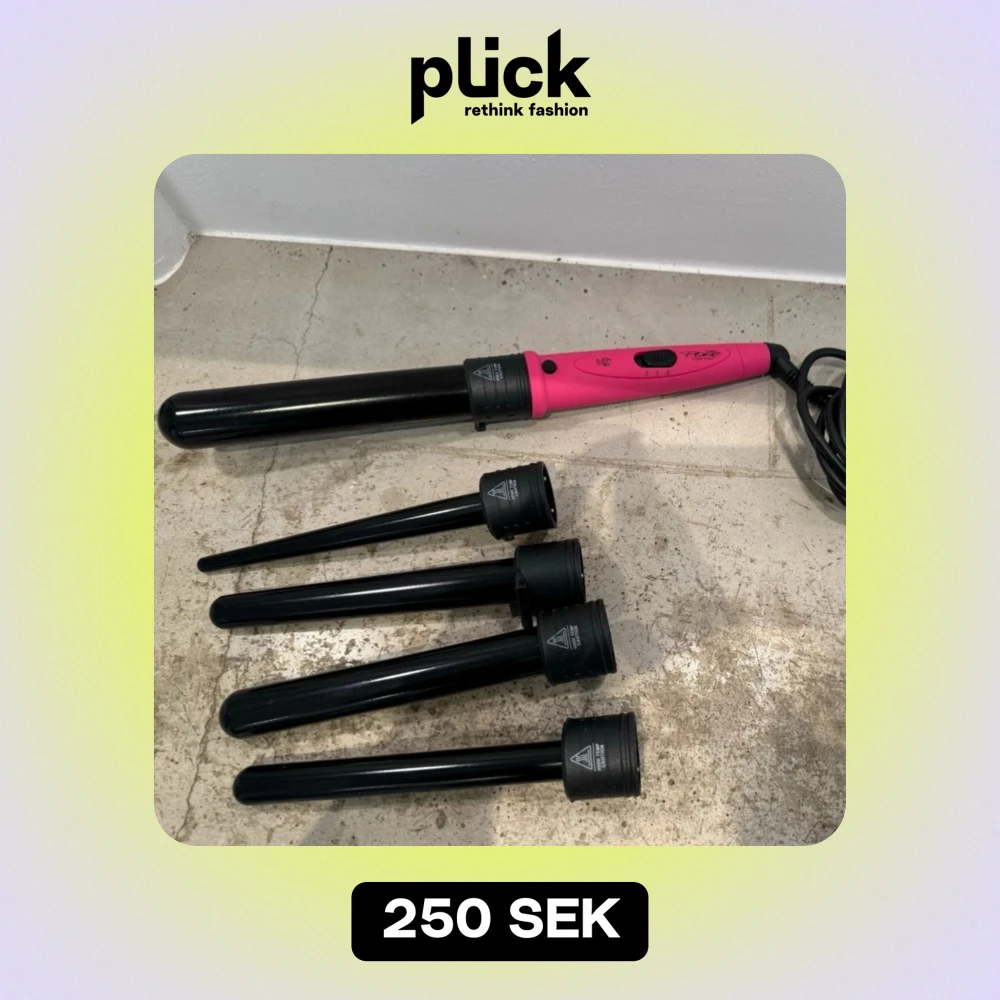 Säljer en rosa locktång med fem utbytbara svarta stavar i olika storlekar. Perfekt för att styla håret till både vardag och fest. Locktången har en sladd och är enkel att använda. Den är från poze och säljs på lyko för över 1000