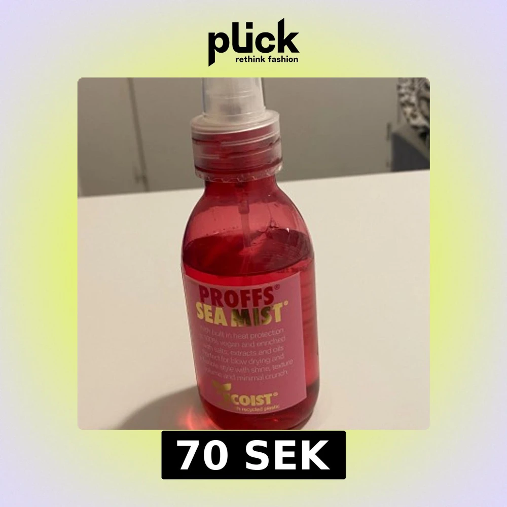 Proffs Sea Mist Face Mist i en genomskinlig röd plastflaska med sprayfunktion. Innehåller extrakt av ros, goji och lavendel, är vegansk och tillverkad med återvunnen plast. Ger glans, textur och volym med värmeskydd upp till 60 grader. Perfekt för att fräscha upp huden.