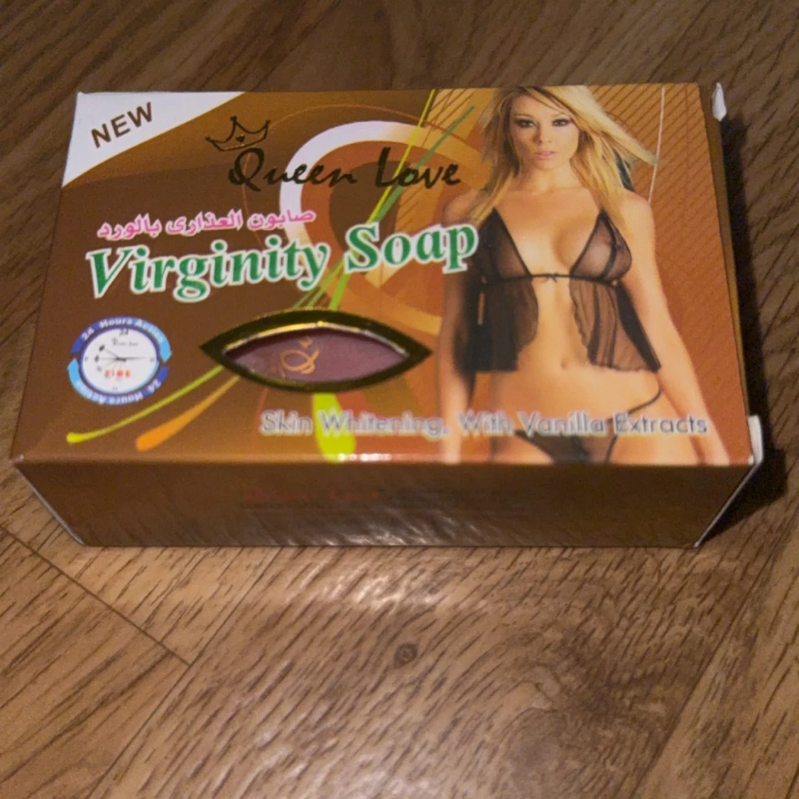 Queen Love Virginity Soap är en hudvårdande tvål med vaniljextrakt som utlovar skin whitening-effekt. Förpackningen är brun med gröna och vita detaljer och visar en kvinna i svart underkläder. Produkten är avsedd för rengöring av huden.