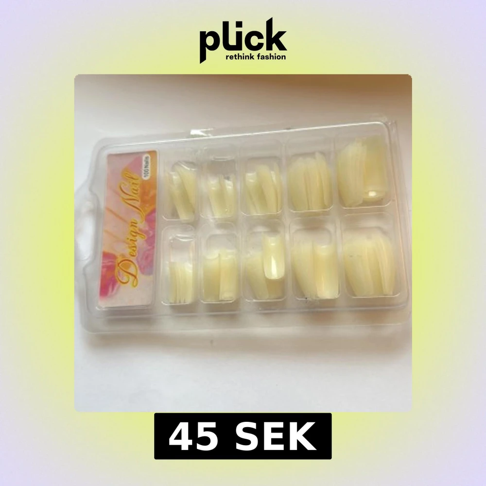 Säljer ett set med 100 konstgjorda naglar från Design Nail i en praktisk plastförpackning. Naglarna är ljusgula och har en klassisk, lätt böjd form som passar för både förlängning och dekoration. Perfekt för dig som vill fixa snygga naglar hemma.