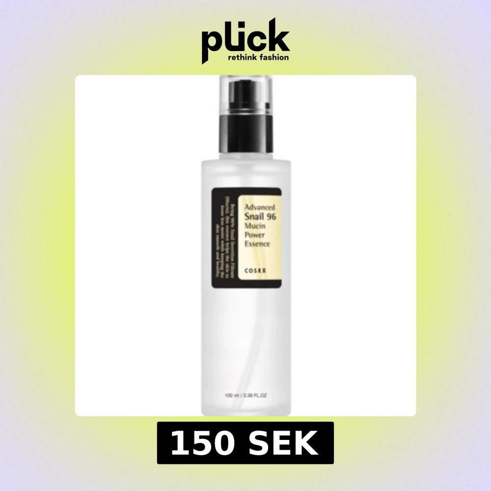 COSRX Advanced Snail 96 Mucin Power Essence i en genomskinlig plastflaska med svart pump och beige etikett. Innehåller 100 ml och är perfekt för att ge huden extra fukt och glow. Essencen har en lätt, gelaktig konsistens och är populär inom K-beauty. Endast testad.