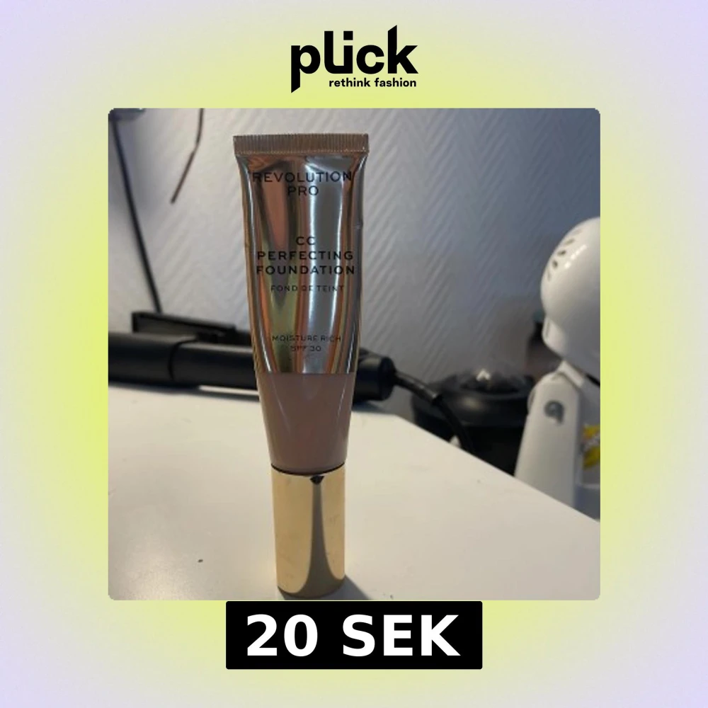 Revolution Pro CC Perfecting Foundation med SPF 30. Denna fuktgivande foundation ger full täckning och en jämn hudton. Förpackningen är elegant med en guldig kork och en metallisk finish.