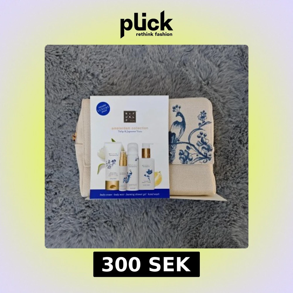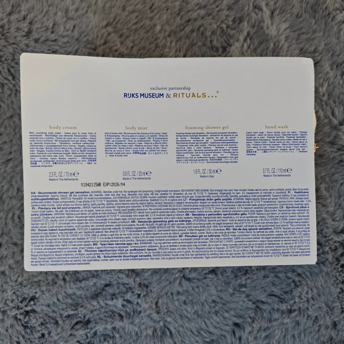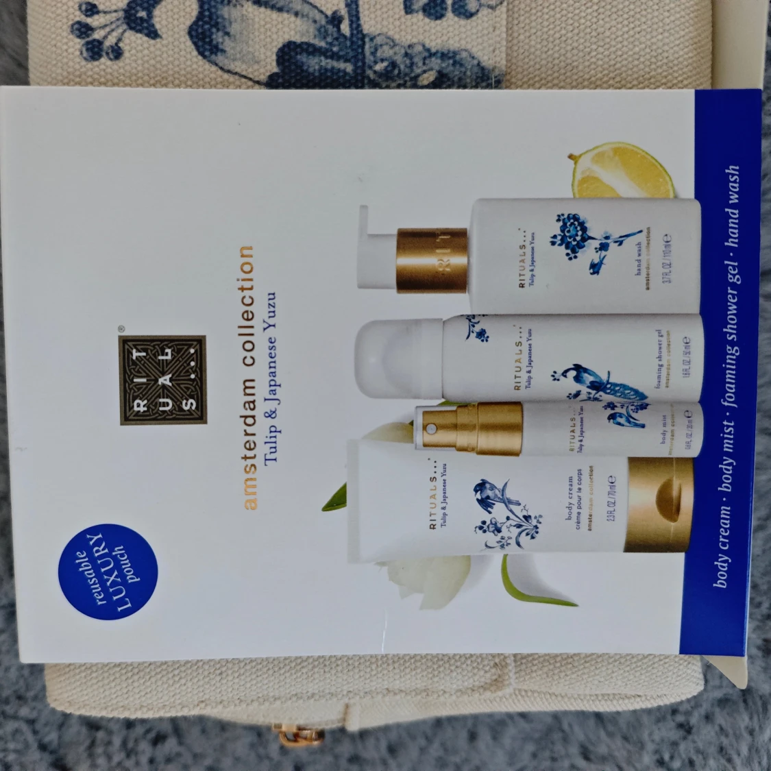 Rituals Amsterdam Collection body mist med doft av tulpan och japansk yuzu. Flaskan är vit med blått och guldigt tryck, inspirerat av klassisk porslinsdesign. Innehåller 20 ml och kommer i en lyxig beige necessär med blått påfågelsmotiv.