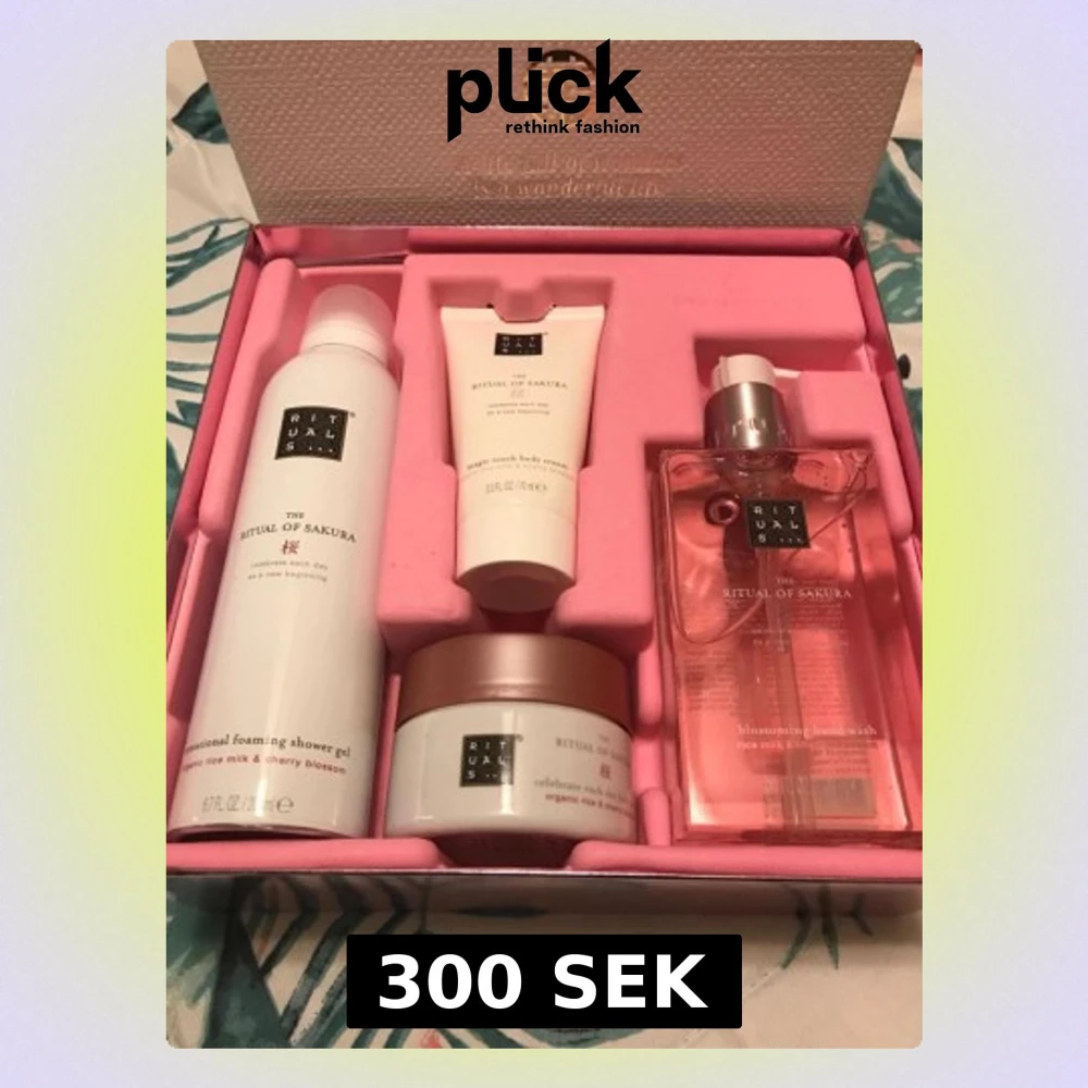 Lyxig presentbox från Rituals med serien The Ritual of Sakura. Innehåller duschskum, body cream, body scrub och handtvål med doft av körsbärsblom och ris. Produkterna kommer i en snygg rosa ask med blommönster och dekorativt band.