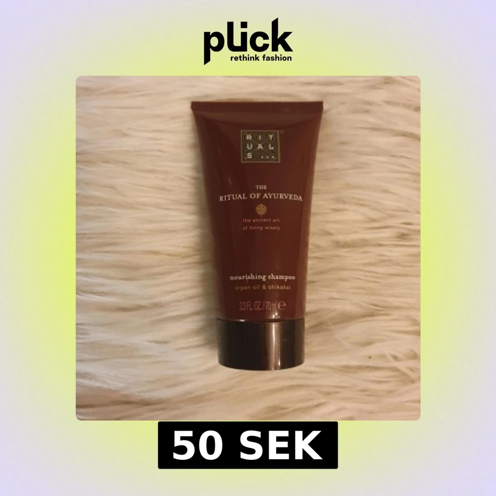 Nourishing shampoo från Rituals The Ritual of Ayurveda med arganolja och shikakai, oanvänd. Kommer i en mörkröd tub på 70 ml med gulddetaljer.